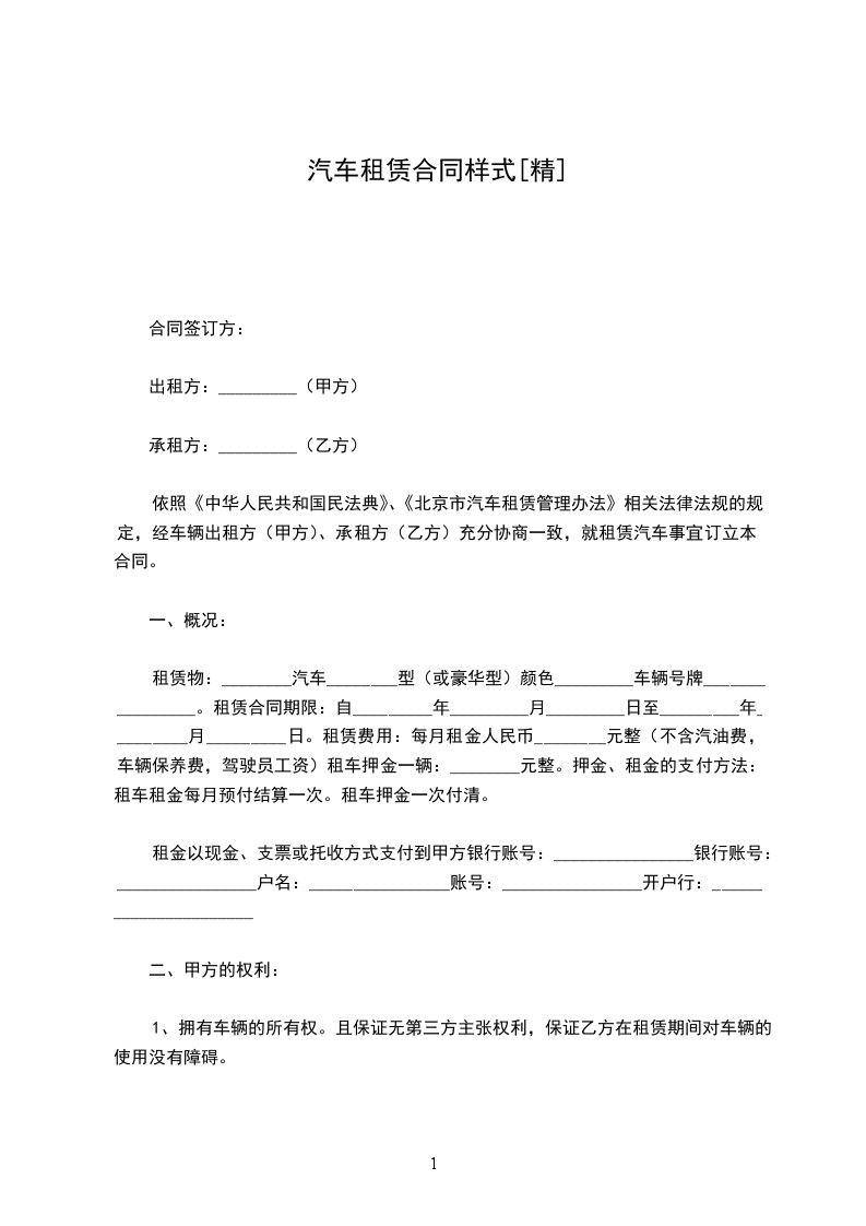依照《中华人民共和国民法典》、《北京市汽车租赁管理办法》相关法律法规的规定,经车辆出租方(甲方)、承租方(乙方)充分协商一致,就租赁汽车事宜订立本合同。