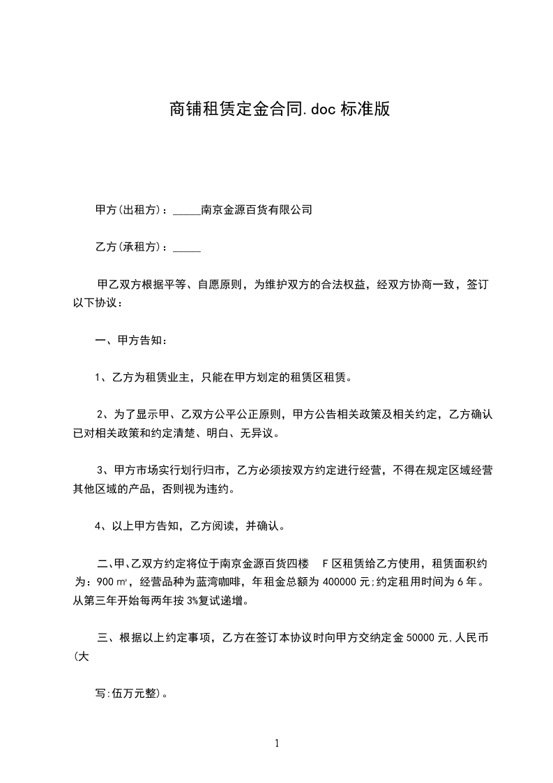 二、甲、乙双方约定将位于南京金源百货四楼F区租赁给乙方使用,租赁面积约为:900㎡,经营品种为蓝湾咖啡,年租金总额为400000元;约定租用时间为6年。从第三年开始每两年按3%复试递增。
