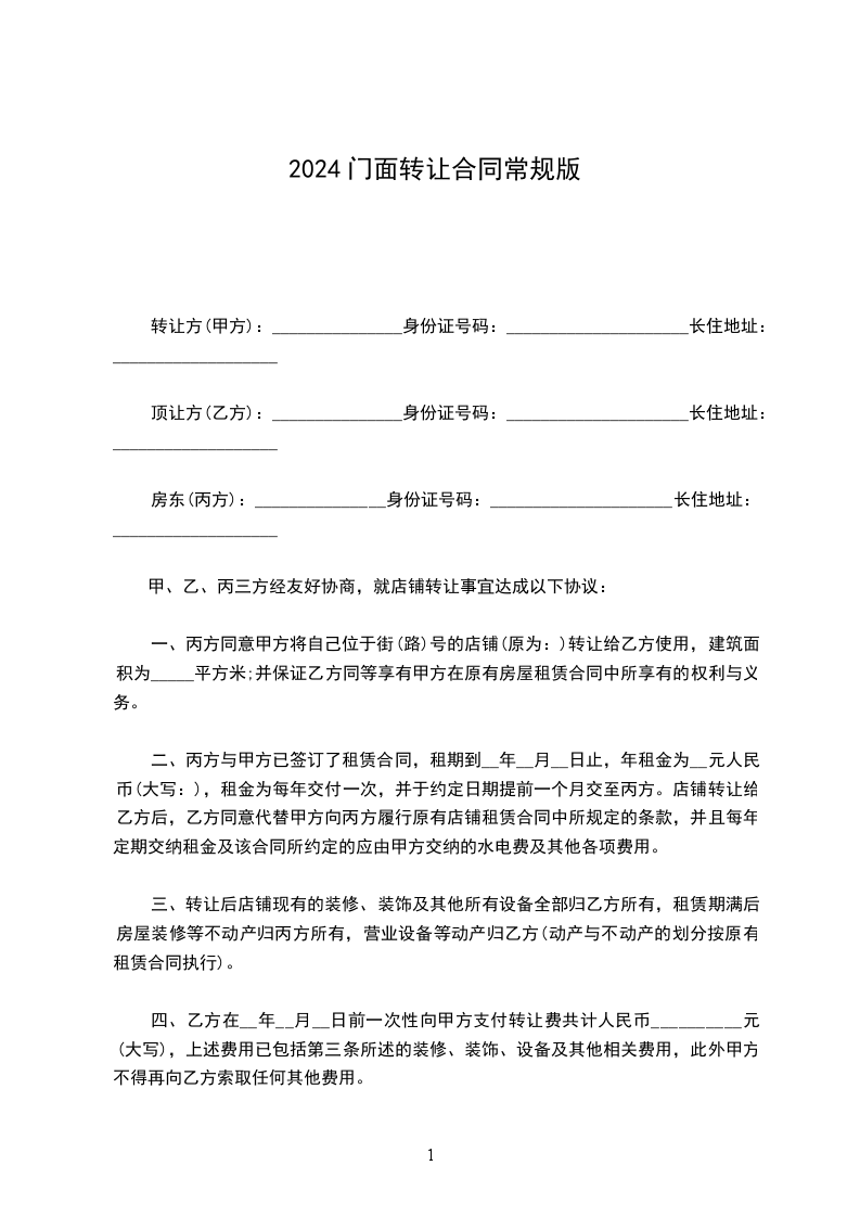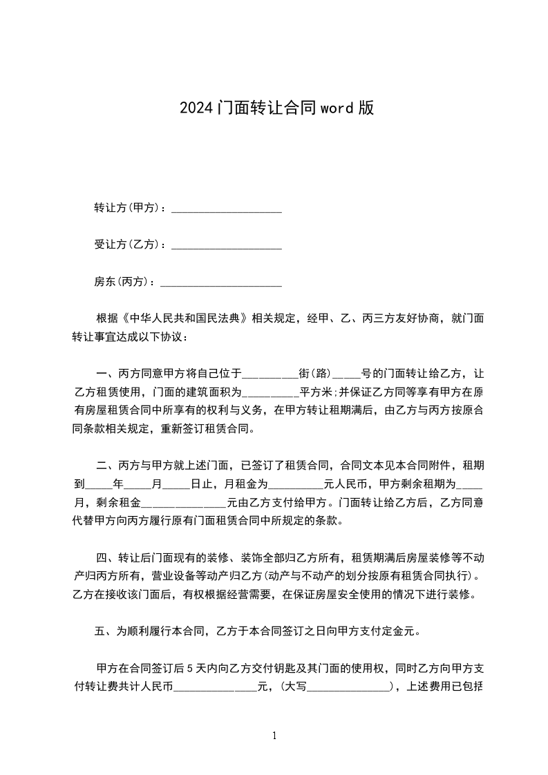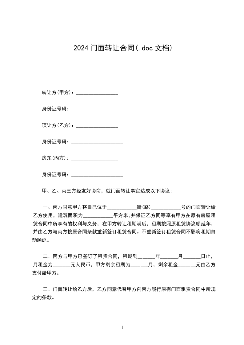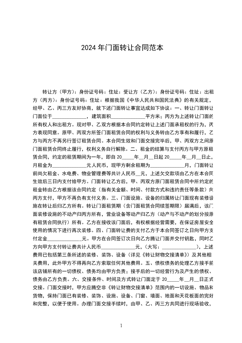 根据我国《中华人民共和国民法典》的有关规定,经甲、乙、丙三方友好协商,就下述门面转让事宜达成如下协议: