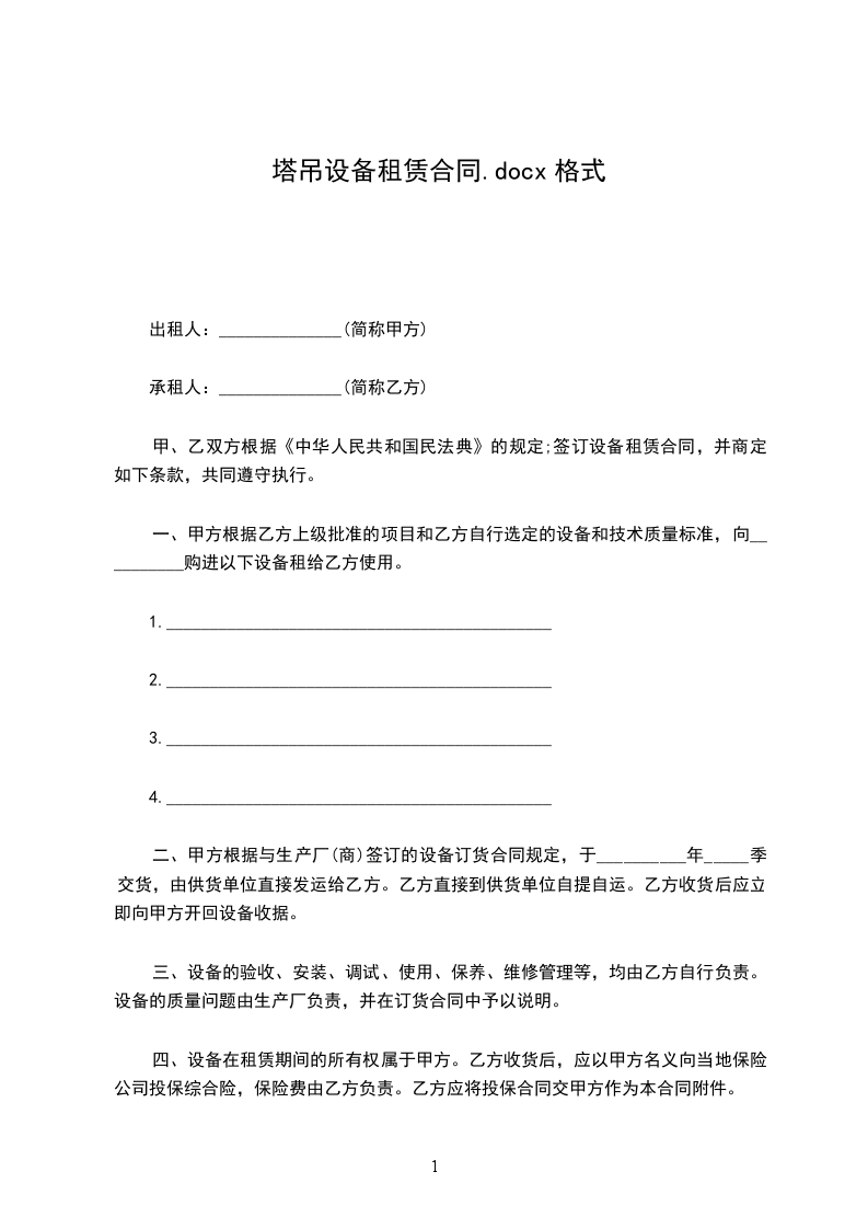 一、甲方根据乙方上级批准的项目和乙方自行选定的设备和技术质量标准,向__________购进以下设备租给乙方使用。