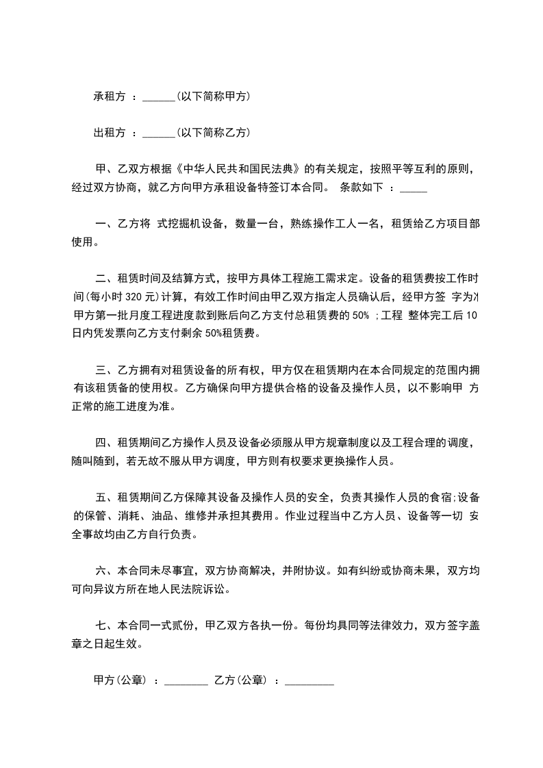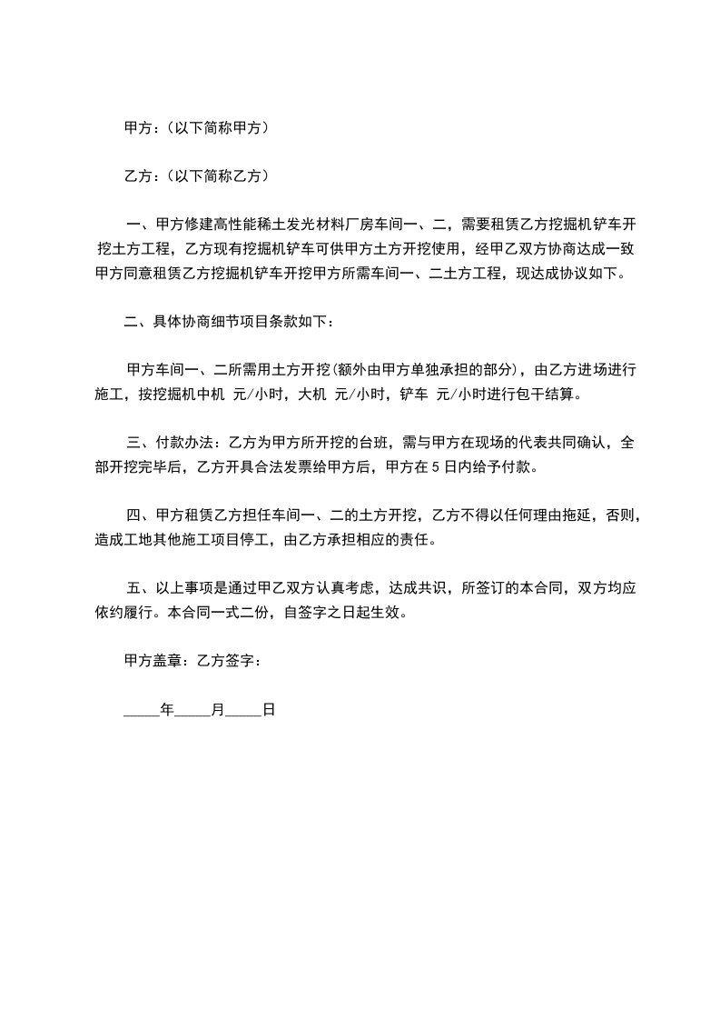由于风井冻结项目部7月份开始筹备施工,因处没有给项目部配备铲车,经请示并取得同意,暂由项目部租赁铲车以供筹备使用。为了保障工作的正常展开,本着互利互惠,互相自愿,公平公正的原则特订立此协议。