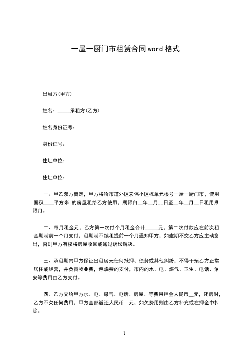 一、甲乙双方商定,甲方将哈市道外区宏伟小区栋单元楼号一屋一厨门市,使用面积____平方米 的房屋租给乙方使用,期限自__年__月__日至__年__月__日租用期限月。
