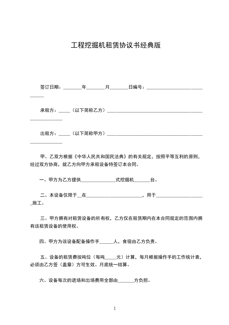 一、甲方为乙方提供_______________式挖掘机_______台。
