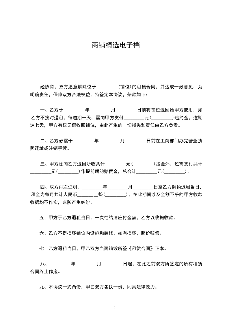 经协商,双方愿意解除位于_________(铺位)的租赁合同,并达成一致意见,为明确责任,保障双方合法权益,特签定本协议,条款如下: