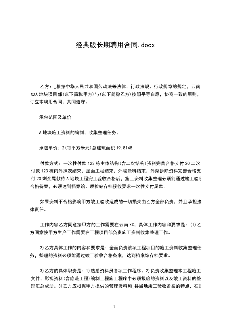 1、本合同系我厅机关事业单位与退休拟返聘人员,在确定聘用关系签定劳动合同时使用的标准文本。
