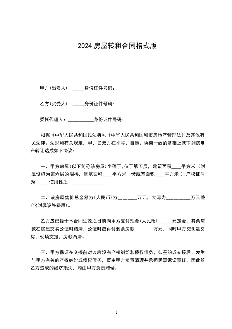 一、甲方房屋(以下简称该房屋)坐落于;位于第五层,建筑面积____平方米 (附属设施为第六层的阁楼,建筑面积____平方米 ;储藏室面积____平方米 );产权证号为_____;使用性质:______________