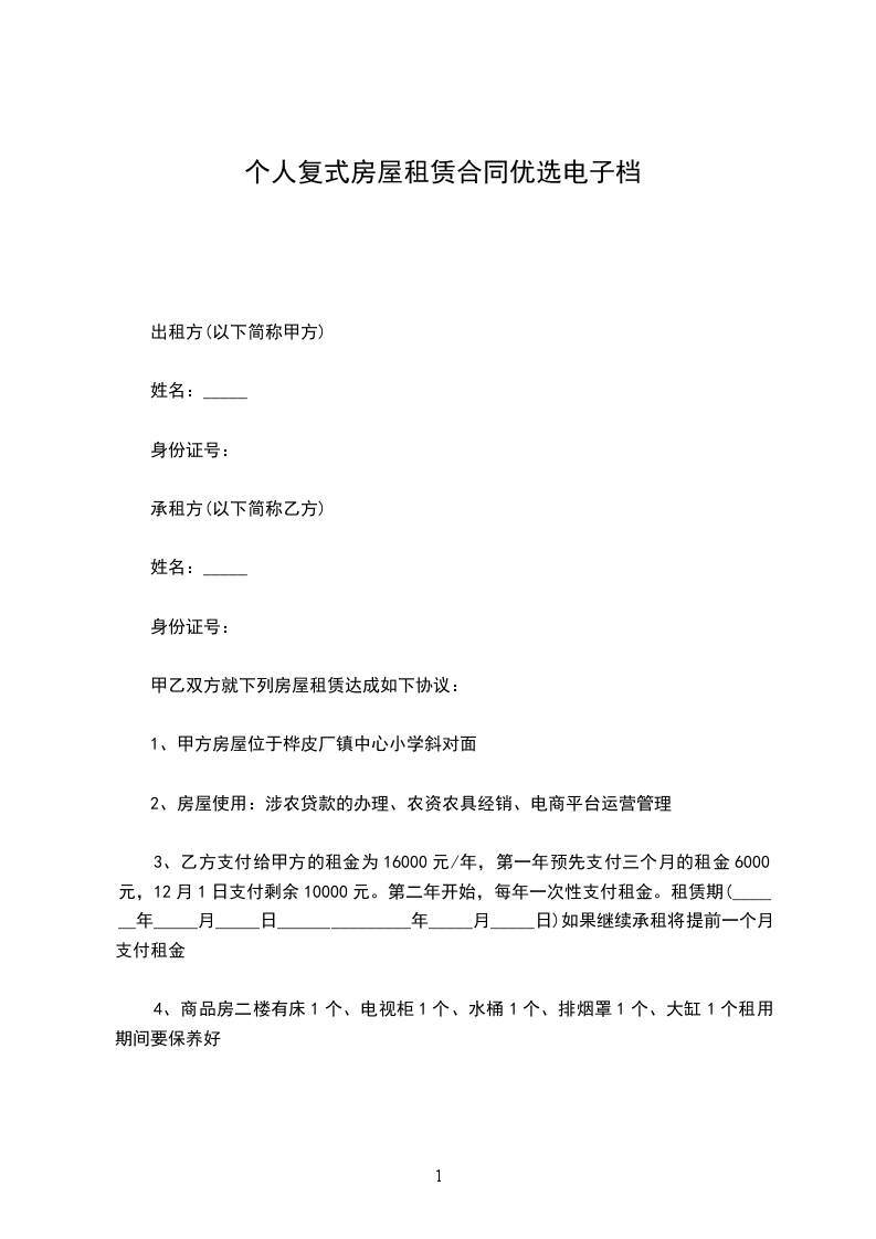 3、乙方支付给甲方的租金为16000元/年,第一年预先支付三个月的租金6000元,12月1日支付剩余10000元。第二年开始,每年一次性支付租金。租赁期(_______年_____月_____日_______________年_____月_____日)如果继续承租将提前一个月支付租金