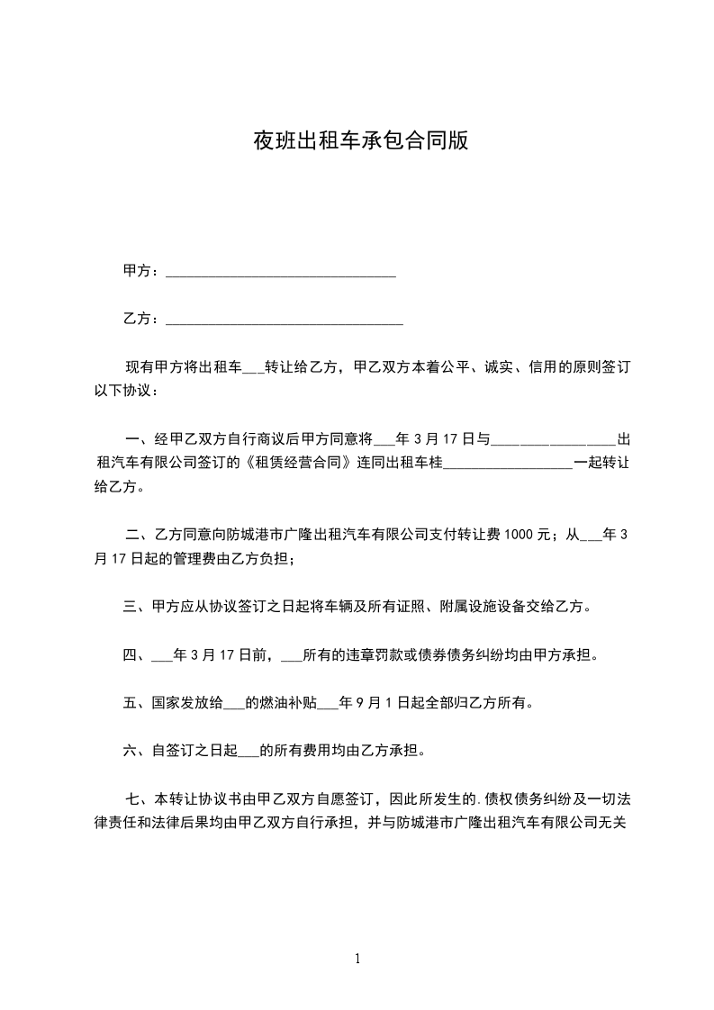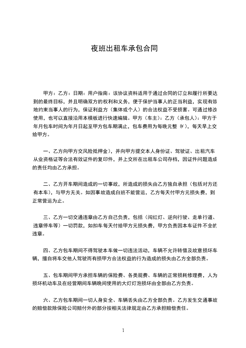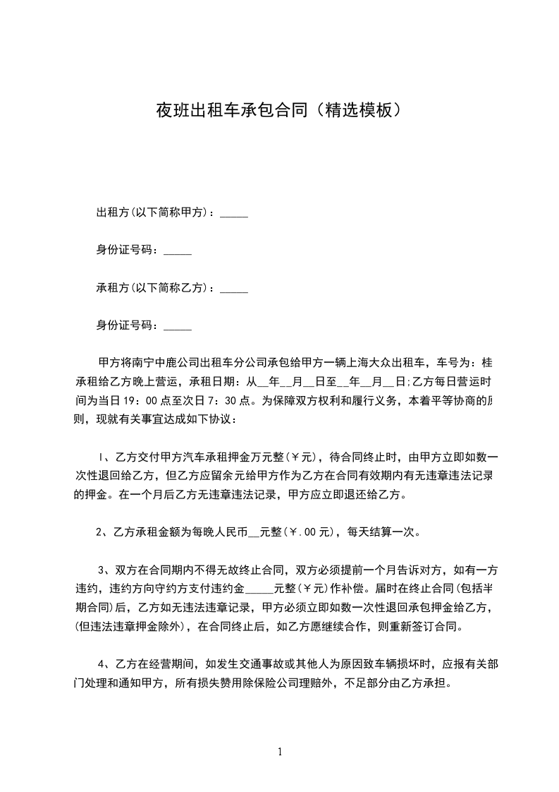 甲方将南宁中鹿公司出租车分公司承包给甲方一辆上海大众出租车,车号为:桂承租给乙方晚上营运,承租日期:从__年__月__日至__年__月__日;乙方每日营运时间为当日19:00点至次日7:30点。为保障双方权利和履行义务,本着平等协商的原则,现就有关事宜达成如下协议: