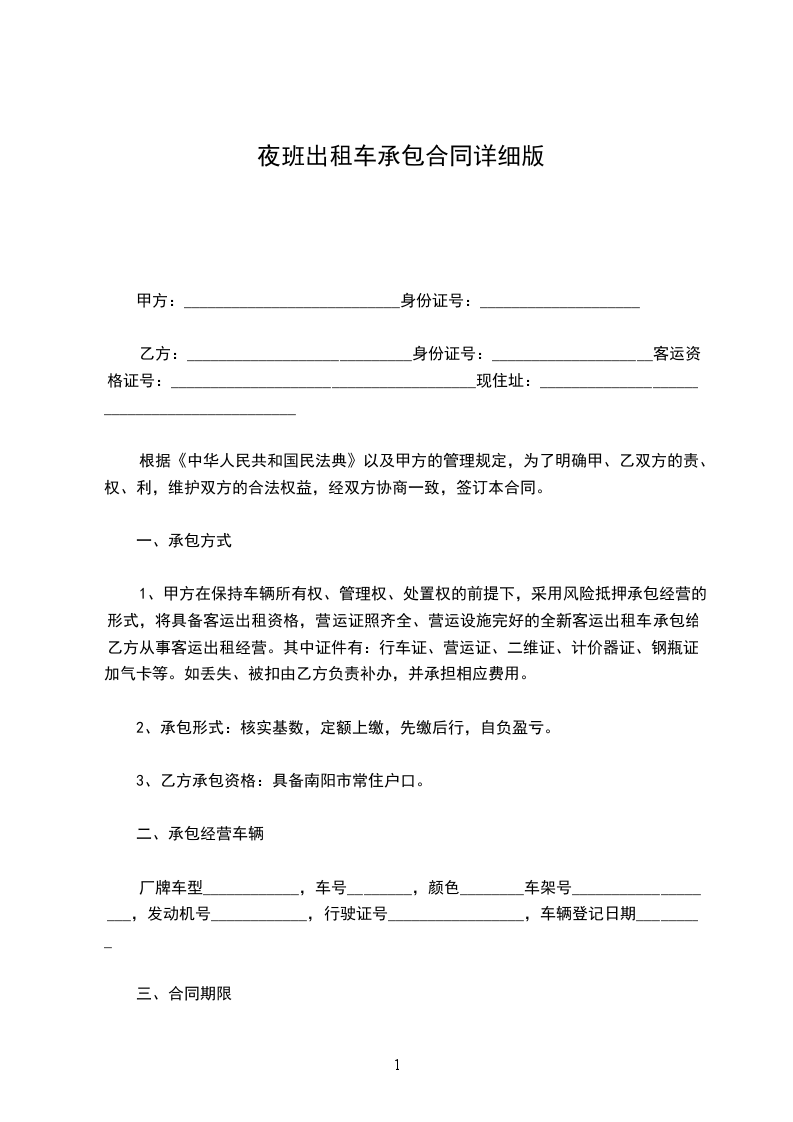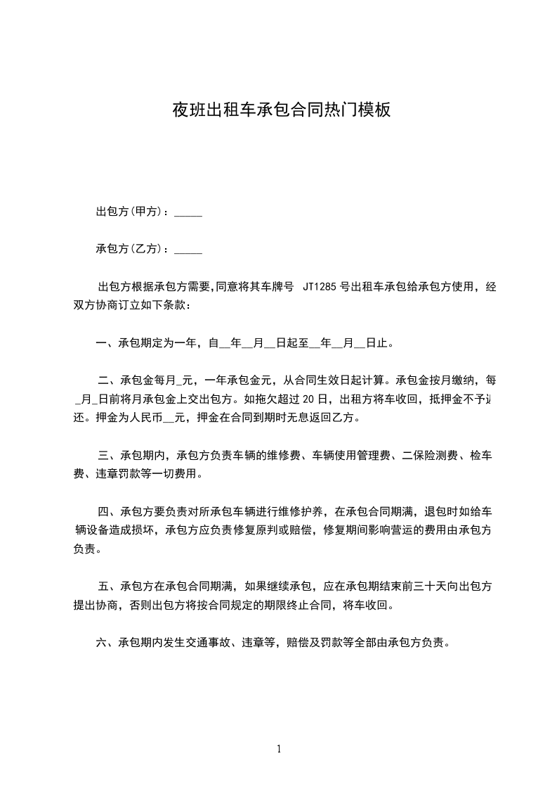 3、双方在合同期内不得无故终止合同,双方必须提前一个月告诉对方,如有一方违约,违约方向守约方支付违约金_____元整(¥元)作补偿。届时在终止合同(包括半期合同)后,乙方如无违法违章记录,甲方必须立即如数一次性退回承包押金给乙方,(但违法违章押金除外),在合同终止后,如乙方愿继续合作,则重新签订合同。