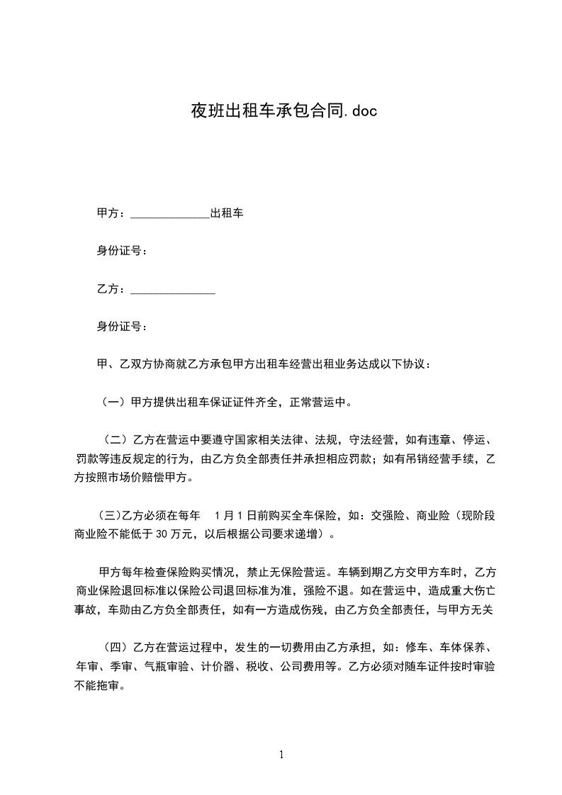4、乙方在经营期间,如发生交通事故或其他人为原因致车辆损坏时,应报有关部门处理和通知甲方,所有损失赞用除保险公司理赔外,不足部分由乙方承担。