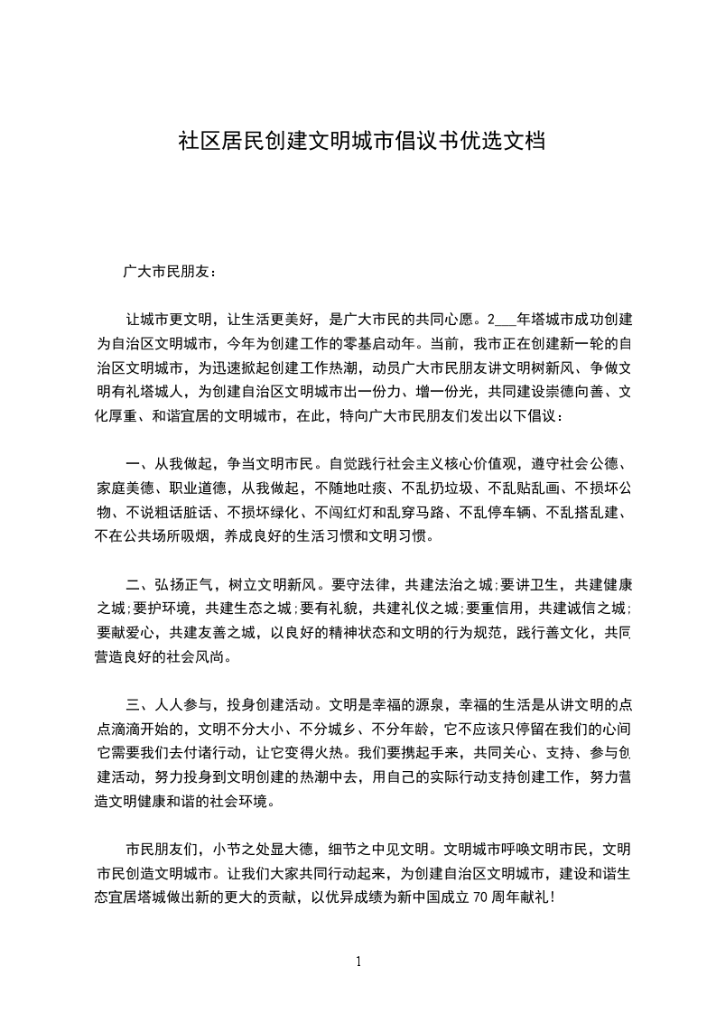 让城市更文明,让生活更美好,是广大市民的共同心愿。2___年塔城市成功创建为自治区文明城市,今年为创建工作的零基启动年。当前,我市正在创建新一轮的自治区文明城市,为迅速掀起创建工作热潮,动员广大市民朋友讲文明树新风、争做文明有礼塔城人,为创建自治区文明城市出一份力、增一份光,共同建设崇德向善、文化厚重、和谐宜居的文明城市,在此,特向广大市民朋友们发出以下倡议:
