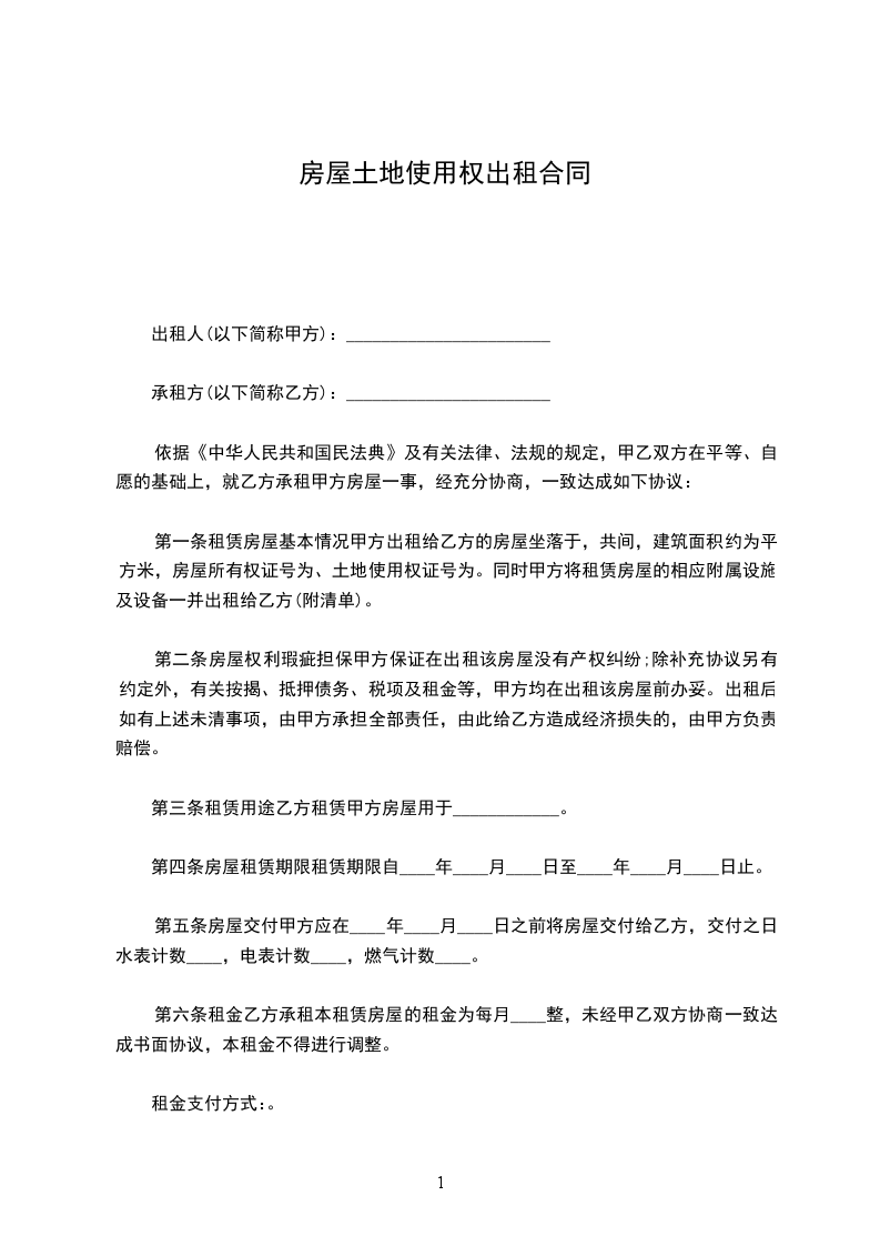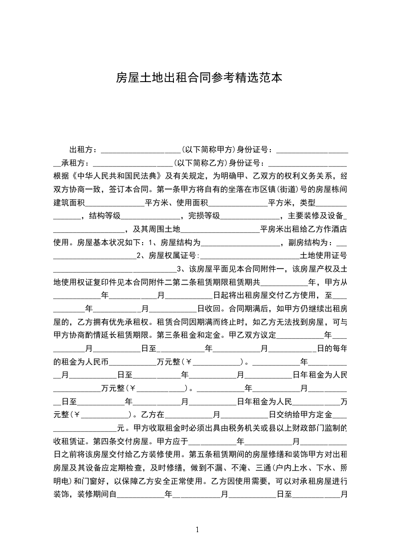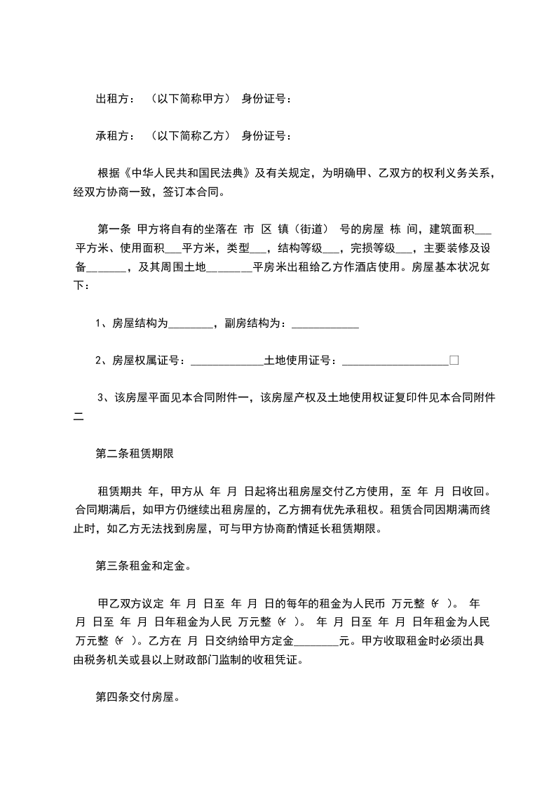 第一条 甲方将自有的坐落在 市 区 镇(街道) 号的房屋 栋 间,建筑面积___平方米、使用面积___平方米,类型___,结构等级___,完损等级___,主要装修及设备_______,及其周围土地________平房米出租给乙方作酒店使用。房屋基本状况如下: