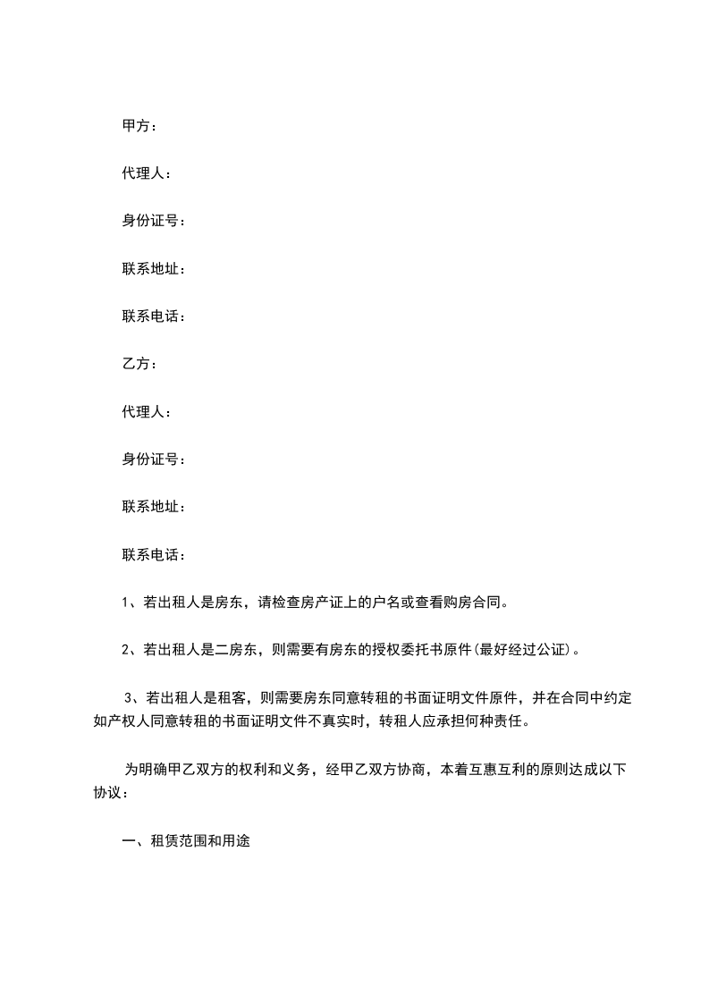 出租方: (以下简称甲方) 身份证号: