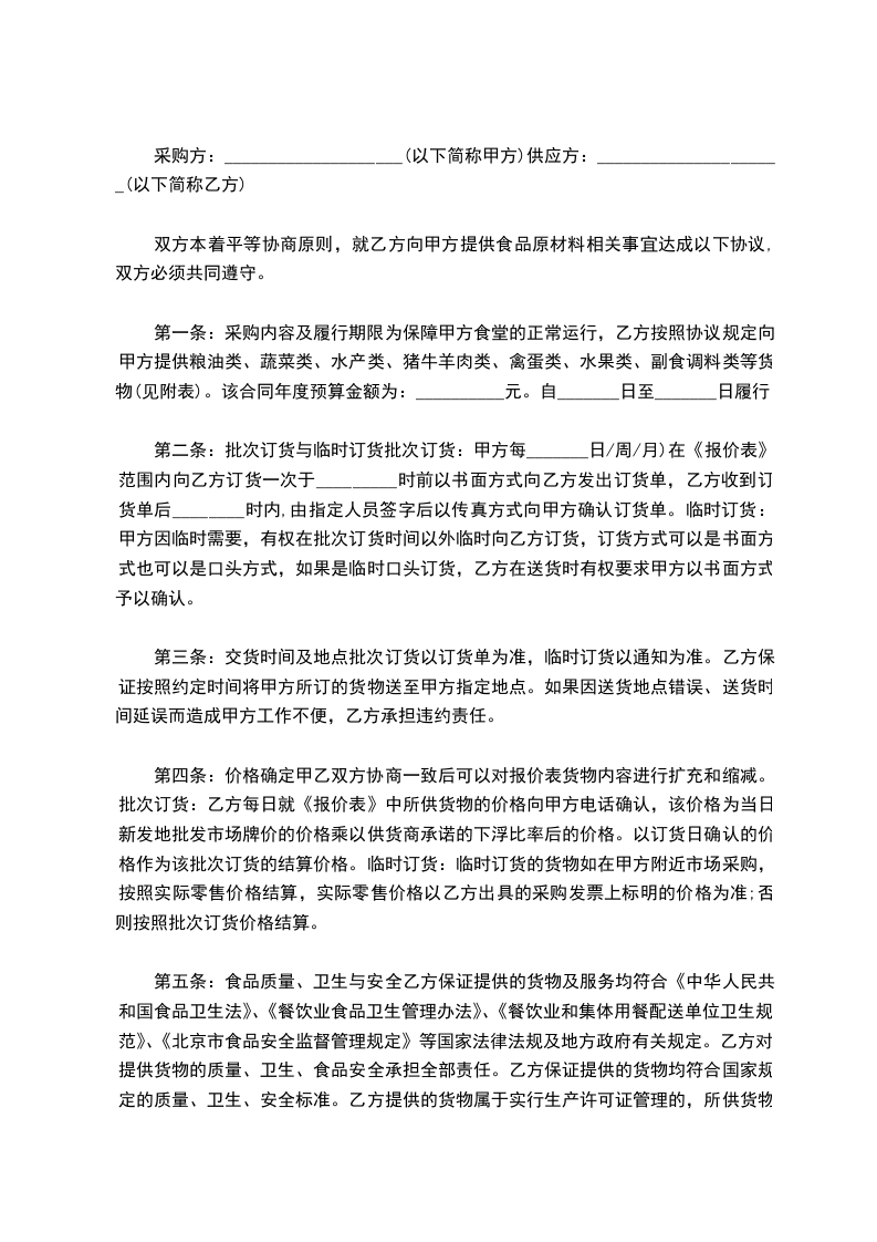 第一条:采购内容及履行期限为保障甲方食堂的正常运行,乙方按照协议规定向甲方提供粮油类、蔬菜类、水产类、猪牛羊肉类、禽蛋类、水果类、副食调料类等货物(见附表)。该合同年度预算金额为:__________元。自_______日至_______日履行。