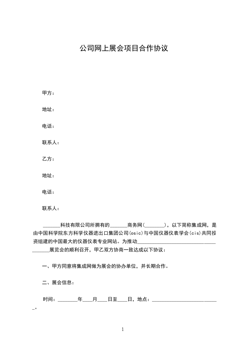_______科技有限公司所拥有的_______商务网(________),以下简称集成网,是由中国科学院东方科学仪器进出口集团公司(osic)与中国仪器仪表学会(cis)共同投资组建的中国最大的仪器仪表专业网站。为推动_______________________________________展览会的顺利召开,甲乙双方协商一致达成以下协议: