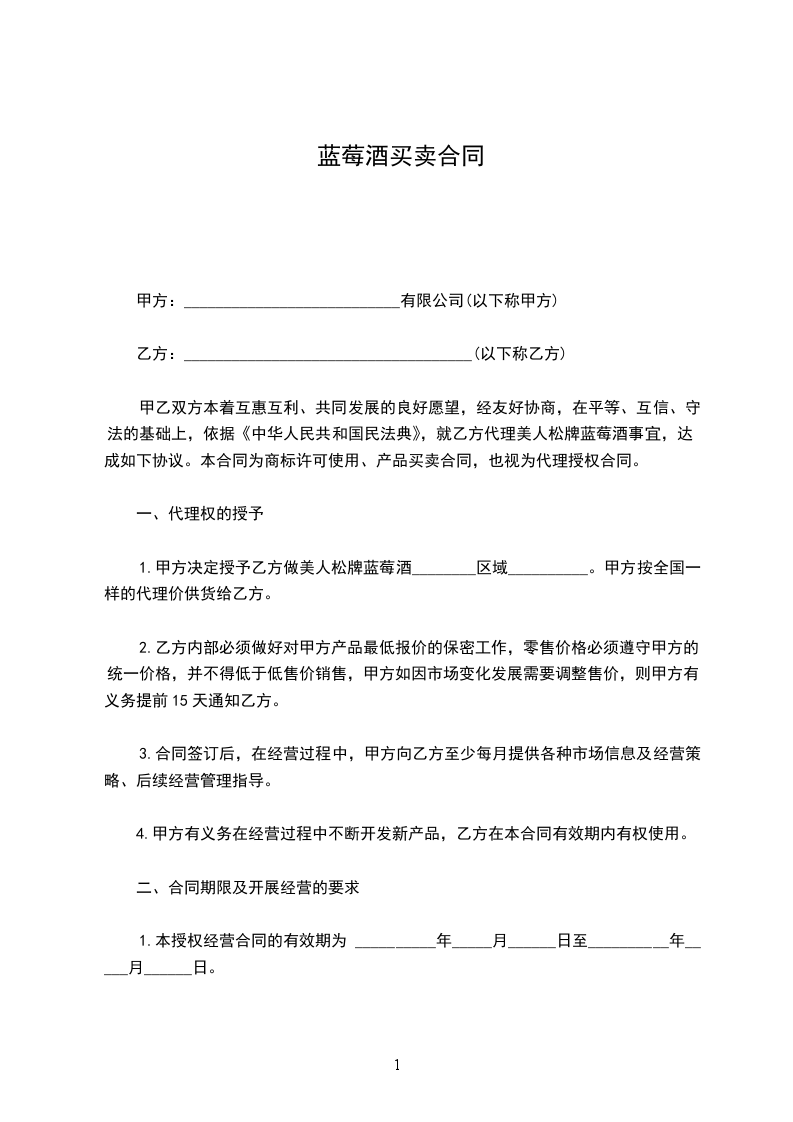 1.甲方决定授予乙方做美人松牌蓝莓酒________区域__________。甲方按全国一样的代理价供货给乙方。