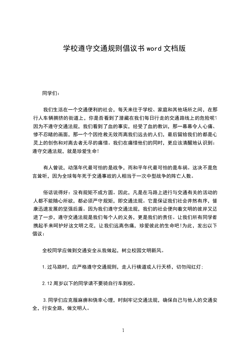 俗话说得好:没有规矩不成方圆。因此,凡是在马路上进行与交通有关的活动的人都不能随心所欲,都必须严守规矩,即交通法规。它是保证我们社会井然有序,健康迅速发展的坚强后盾。因为我们遵守交通法规,我们的社会便向着文明的彼岸又迈进了一步,遵守交通法规是我们每个人的义务,更是我们的责任。让我们所有同学都携起手来呵护好这文明之花,让我们远离伤痛,珍爱彼此的生命吧!为此,发出以下倡议: