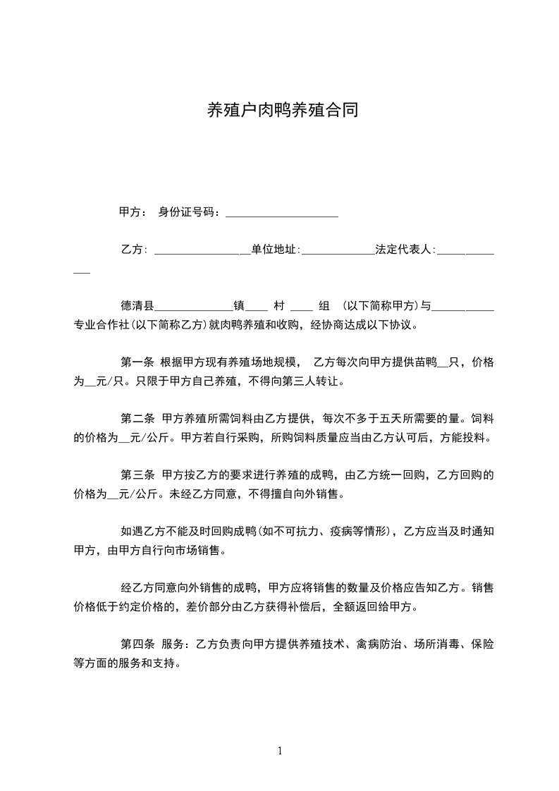 第一条 根据甲方现有养殖场地规模, 乙方每次向甲方提供苗鸭__只,价格为__元/只。只限于甲方自己养殖,不得向第三人转让。