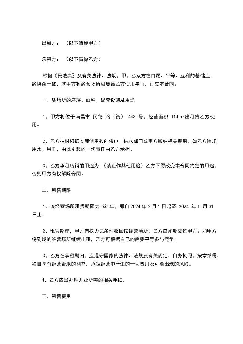 1、该经营场所租赁期限为 叁 年,即自2024年2月1日起至 2024 年1 月31日止。