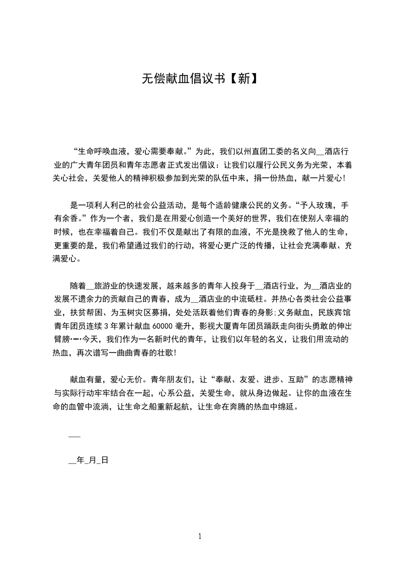 “生命呼唤血液,爱心需要奉献。”为此,我们以州直团工委的名义向__酒店行业的广大青年团员和青年志愿者正式发出倡议:让我们以履行公民义务为光荣,本着关心社会,关爱他人的精神积极参加到光荣的队伍中来,捐一份热血,献一片爱心!