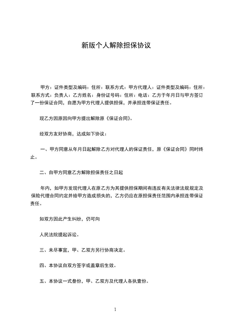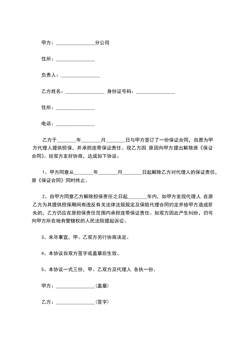 一、甲方同意从 年 月 日起解除乙方对代理人的保证责任,原《保证合同》同时终止。