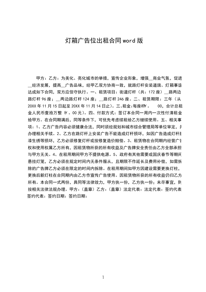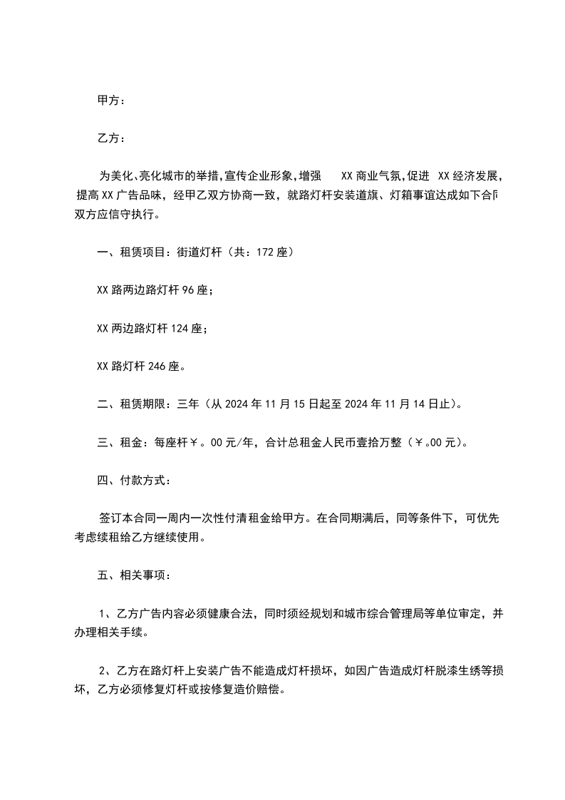 为美化、亮化城市的举措,宣传企业形象,增强XX商业气氛,促进XX经济发展,提高XX广告品味,经甲乙双方协商一致,就路灯杆安装道旗、灯箱事谊达成如下合同,双方应信守执行。