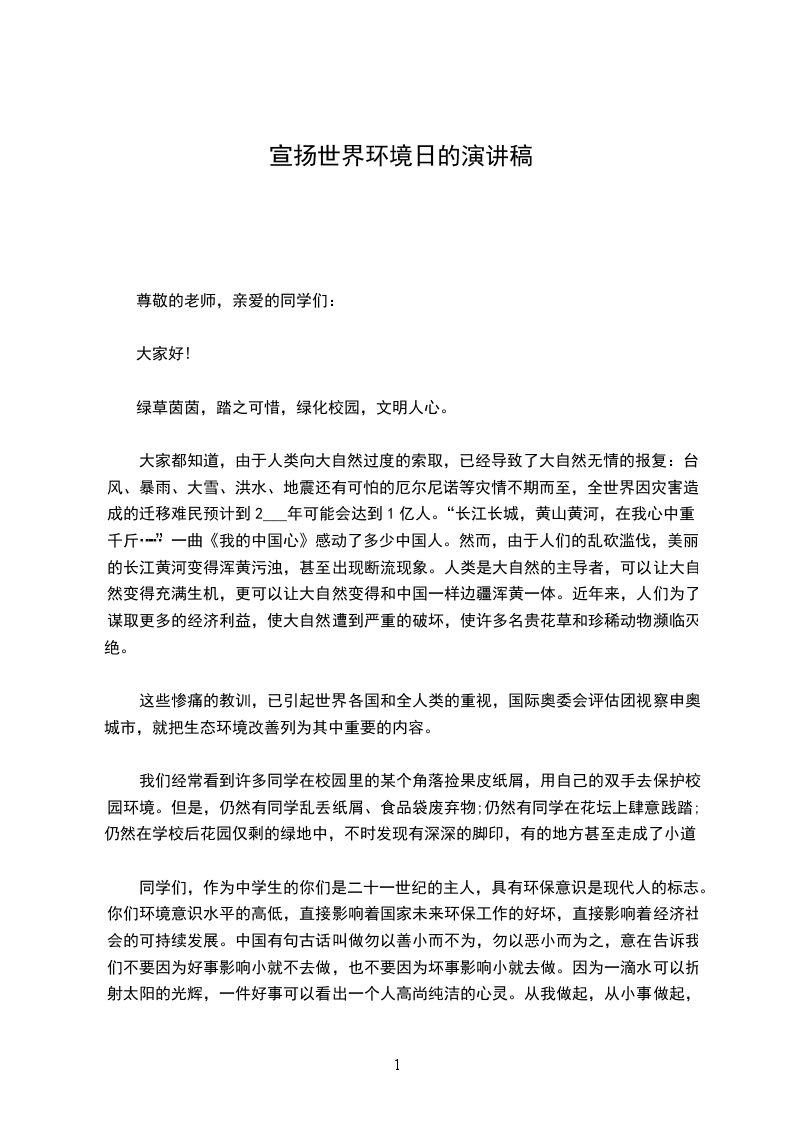 同学们,作为中学生的你们是二十一世纪的主人,具有环保意识是现代人的标志。你们环境意识水平的高低,直接影响着国家未来环保工作的好坏,直接影响着经济社会的可持续发展。中国有句古话叫做勿以善小而不为,勿以恶小而为之,意在告诉我们不要因为好事影响小就不去做,也不要因为坏事影响小就去做。因为一滴水可以折射太阳的光辉,一件好事可以看出一个人高尚纯洁的心灵。从我做起,从小事做起,减少超前消费、炫耀性消费、奢侈性消费和铺张浪费现象,实现生活方式和消费模式向勤俭节约、绿色低碳、文明健康的方式转变;着眼身边,人人洁身自爱,个个遵守公德,我们的校园一定会更加干净、整洁、美丽。