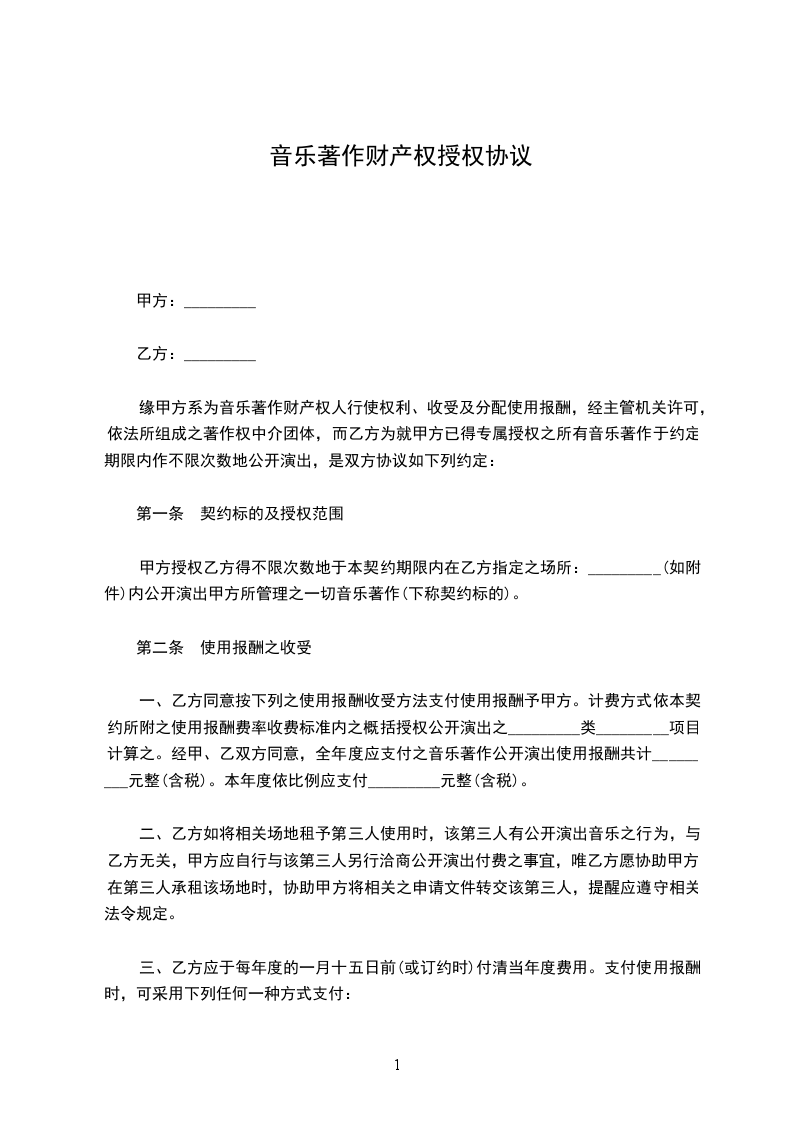 一、乙方同意按下列之使用报酬收受方法支付使用报酬予甲方。计费方式依本契约所附之使用报酬费率收费标准内之概括授权公开演出之 _________类_________项目计算之。经甲、乙双方同意,全年度应支付之音乐著作公开演出使用报酬共计_________元整(含税)。本 年度依比例应支付_________元整(含税)。