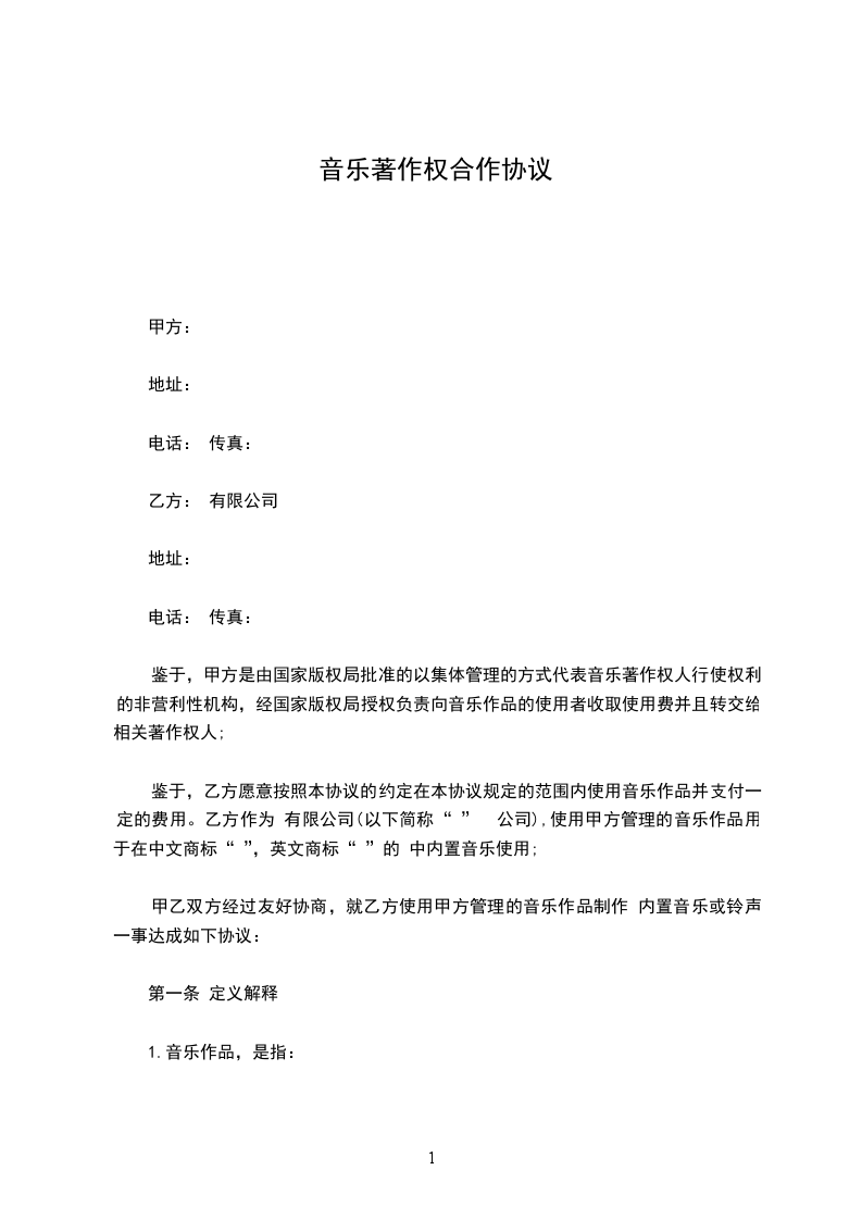 甲方授权乙方得不限次数地于本契约期限内在乙方指定之场所:_________(如附件)内公开演出甲方所管理之一切音乐著作(下称契约标的)。