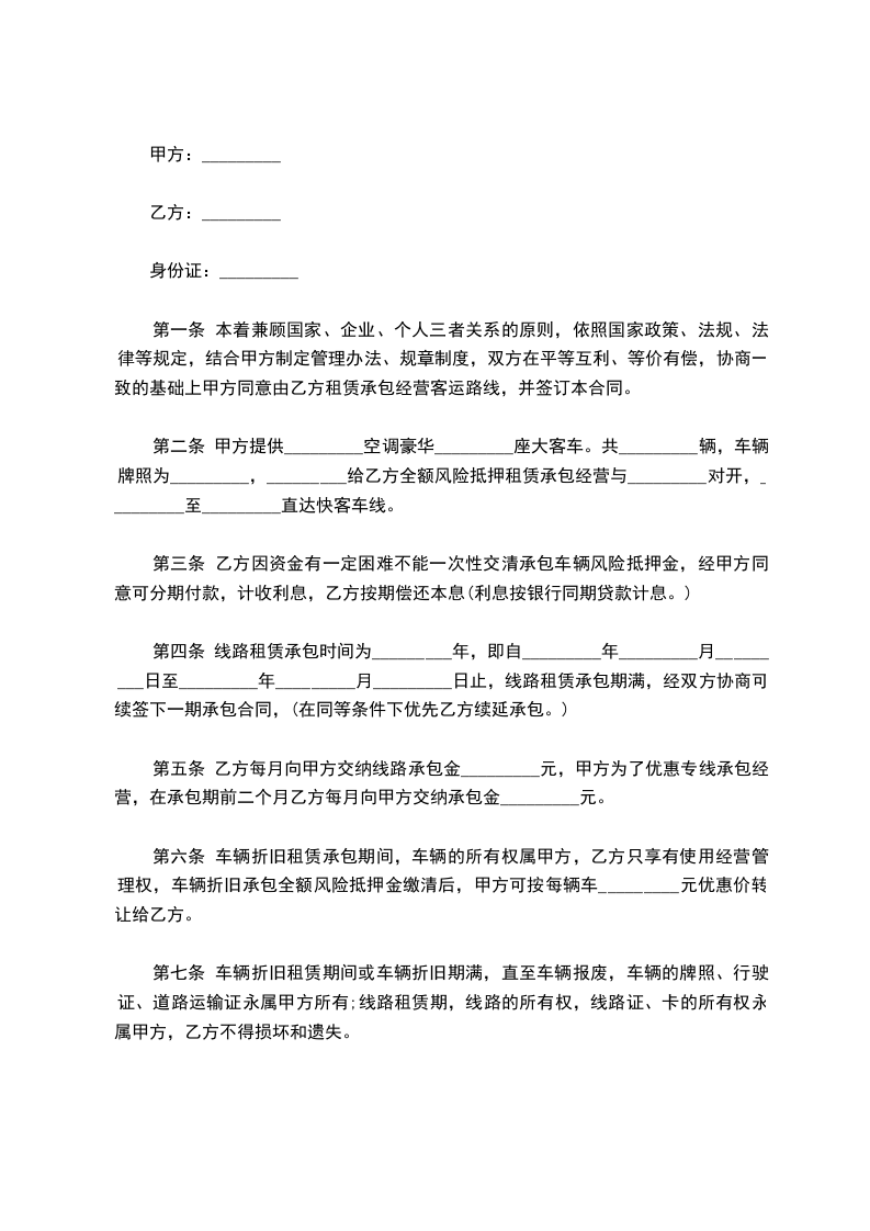 第二条 甲方提供_________空调豪华_________座大客车。共_________辆,车辆牌照为_________,_________给乙方全额风险抵押租赁承包经营与_________对开,_________至_________直达快客车线。