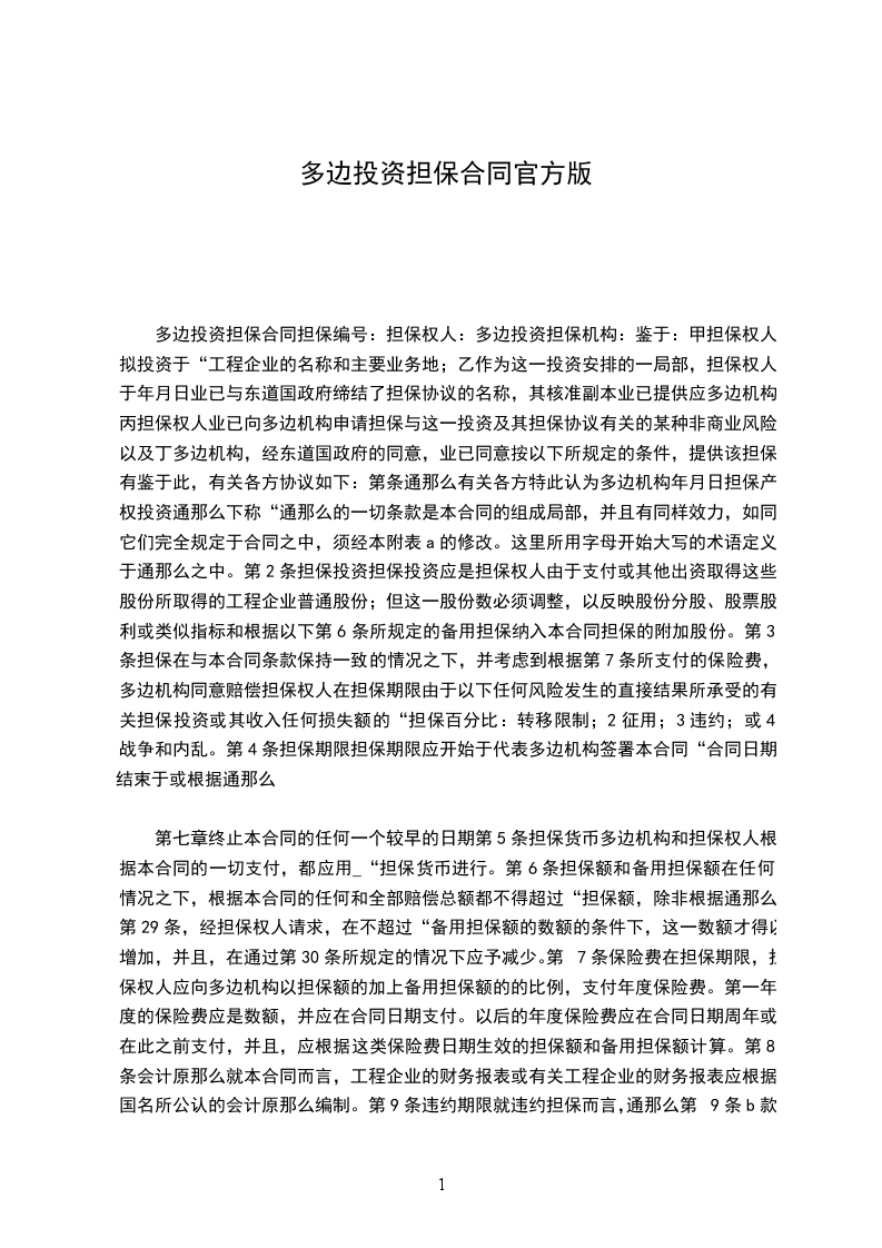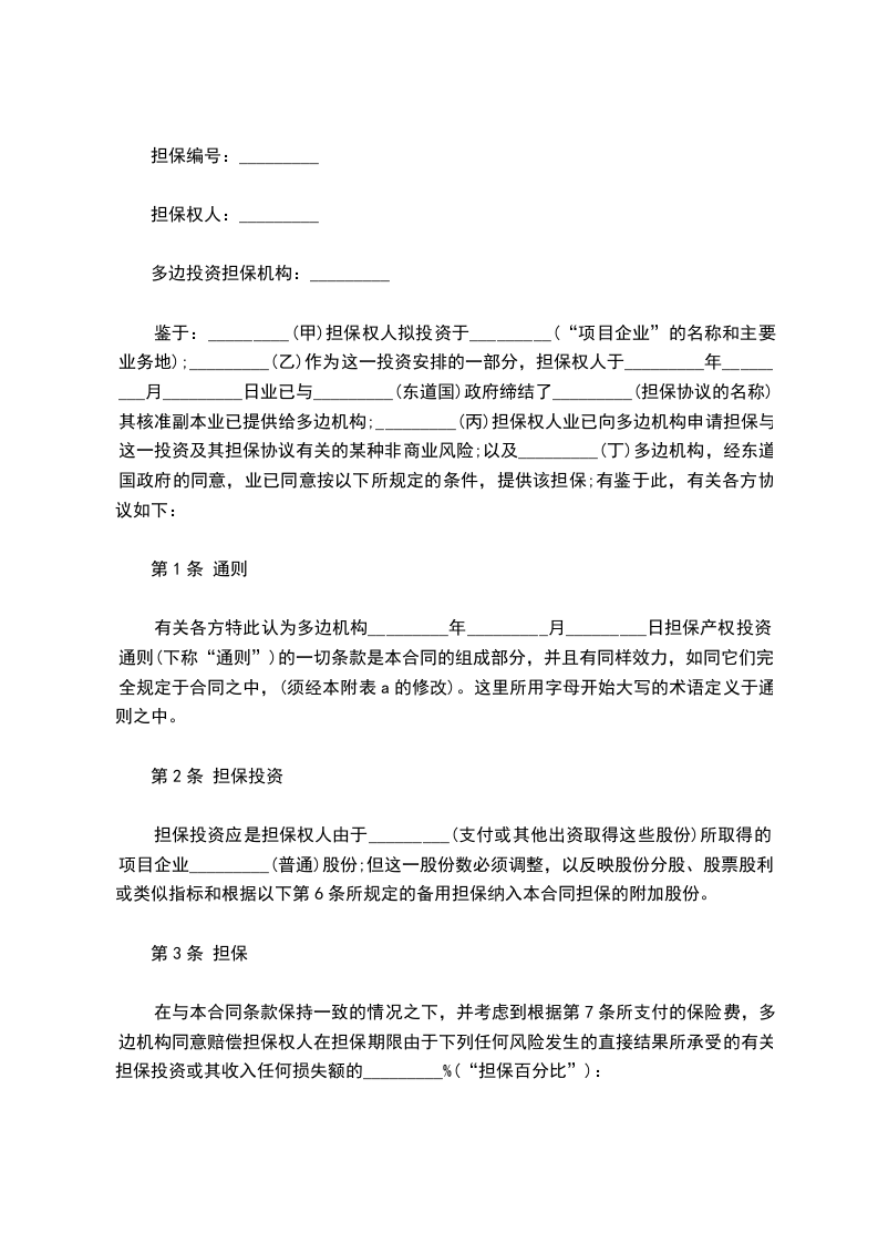 鉴于:_________(甲)担保权人拟投资于_________(“项目企业”的名称和主要业务地);_________(乙)作为这一投资安排的一部分,担保权人于_________年_________月_________日业已与_________(东道国)政府缔结了_________(担保协议的名称),其核准副本业已提供给多边机构;_________(丙)担保权人业已向多边机构申请担保与这一投资及其担保协议有关的某种非商业风险;以及_________(丁)多边机构,经东道国政府的同意,业已同意按以下所规定的条件,提供该担保;有鉴于此,有关各方协议如下: