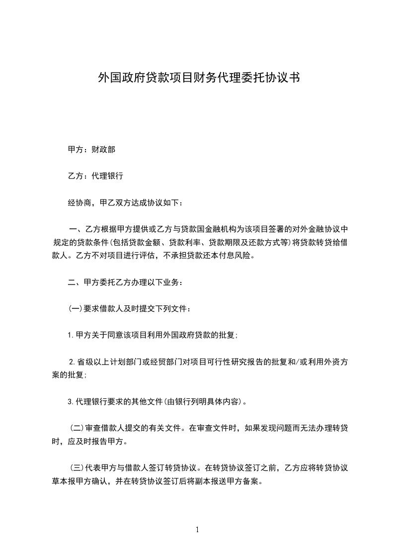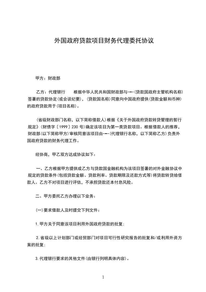 (省级财政部门名称,以下简称借款人)根据《关于外国政府贷款转贷管理的暂行规定》(财债字〔1999〕230号)确定该项目为第一类贷款项目。根据借款人的推荐,财政部(以下简称甲方)审核同意该项目由……(代理银行名称,以下简称乙方)负责外国政府贷款的财务代理工作。