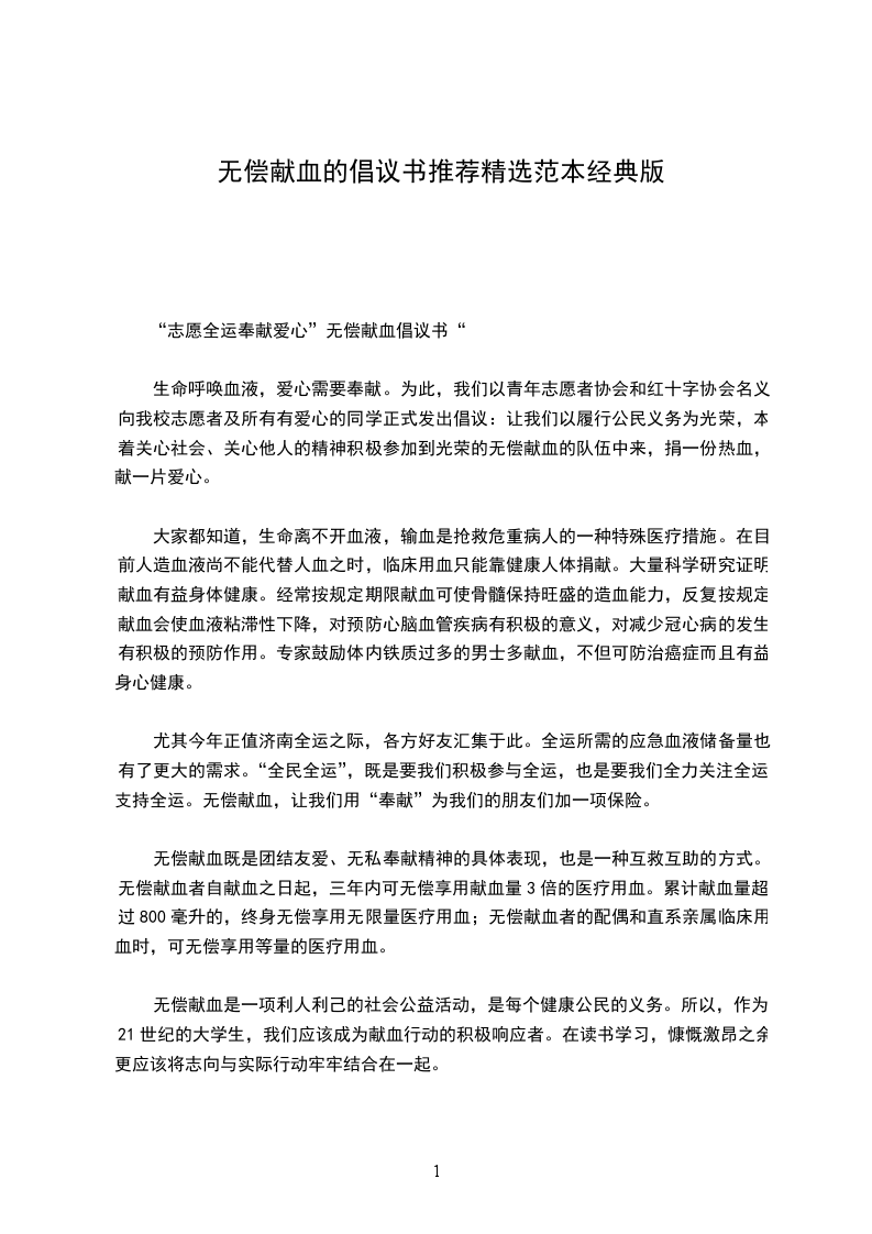 “志愿全运奉献爱心”无偿献血倡议书“