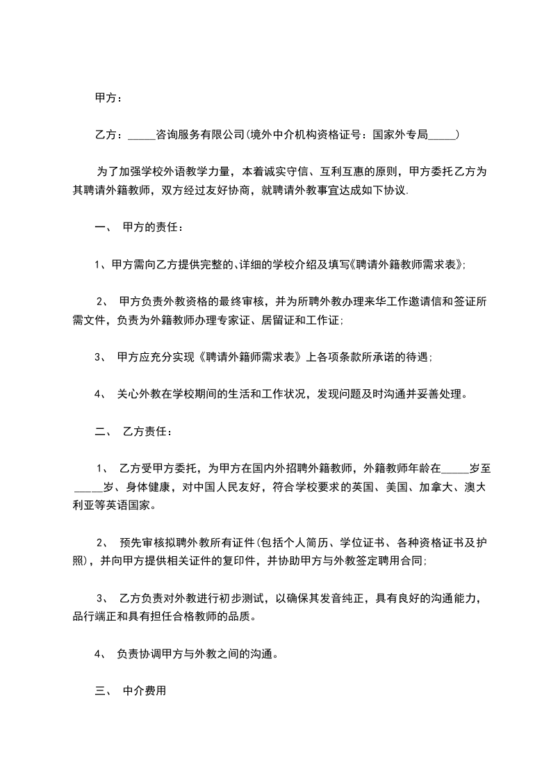 1、 乙方受甲方委托,为甲方在国内外招聘外籍教师,外籍教师年龄在_____岁至_____岁、身体健康,对中国人民友好,符合学校要求的英国、美国、加拿大、澳大利亚等英语国家。