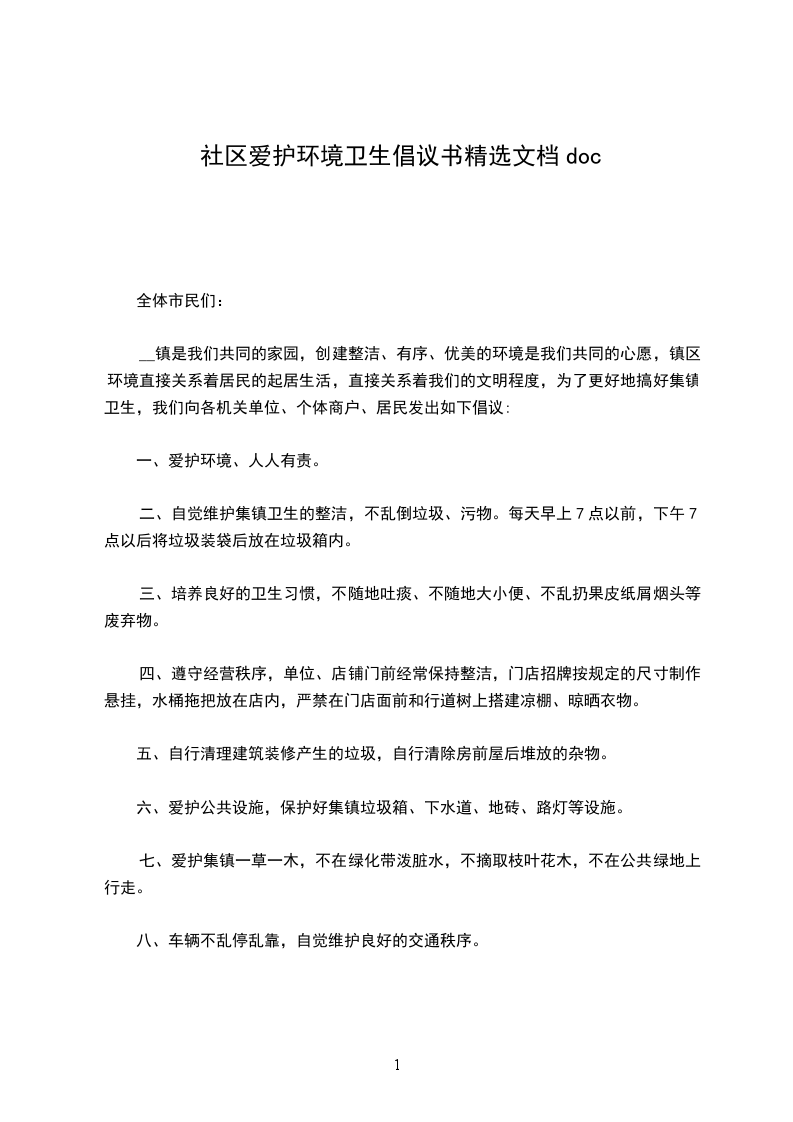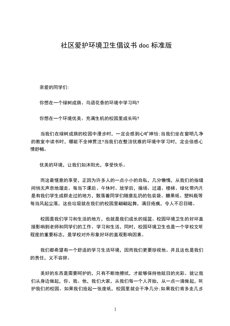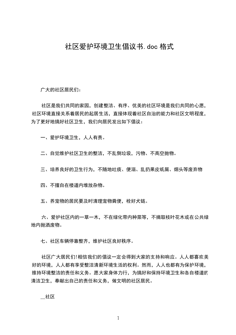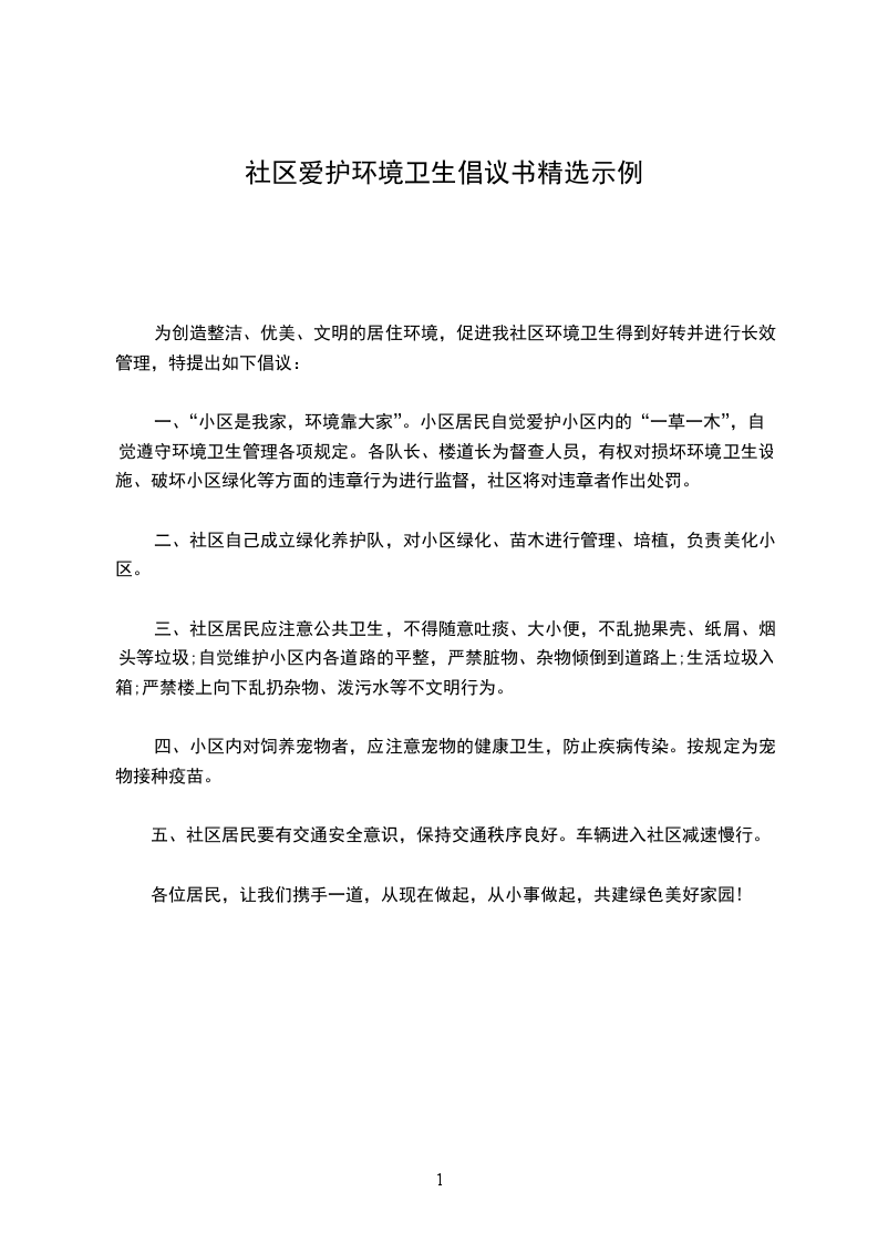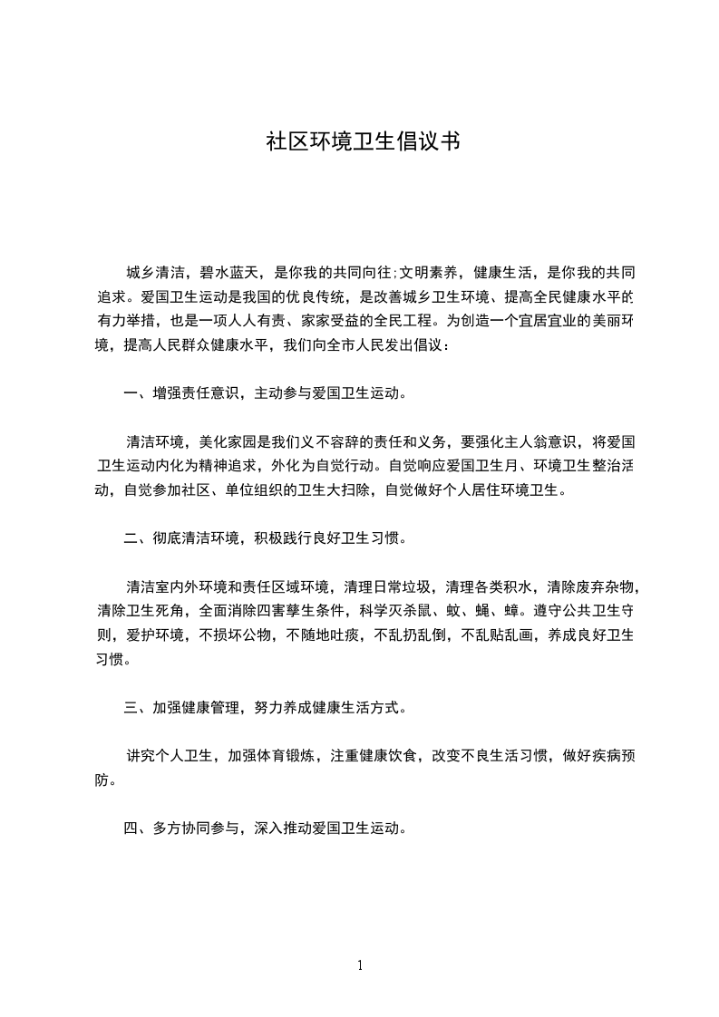 社区文明是社会进步的标志,居住卫生是健康生活的保障。小区卫生环境与每位市民息息相关,创建文明城市需要每位市民的共同参与。为了营造一个更加文明、优美、舒心、安康的生活环境,我们提出如下倡议: