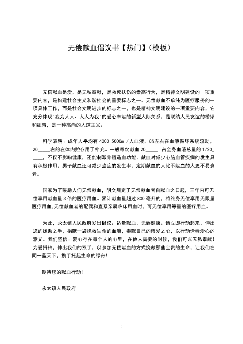 为此,永太镇人民政府发出倡议:适量献血,无碍健康。请立即行动起来,伸出您的援助之手,捐献一袋挽救生命的血液,奉献自己的博爱之心,以行动诠释爱心的意义。我们坚信:爱心存在每个人的心里,在他人需要的时候,我们可以无私奉献!为爱捋袖,伸出我们的双手,以参加无偿献血的方式挽救那些宝贵的生命,让我们在同一蓝天下,携手托起生命的绿舟!