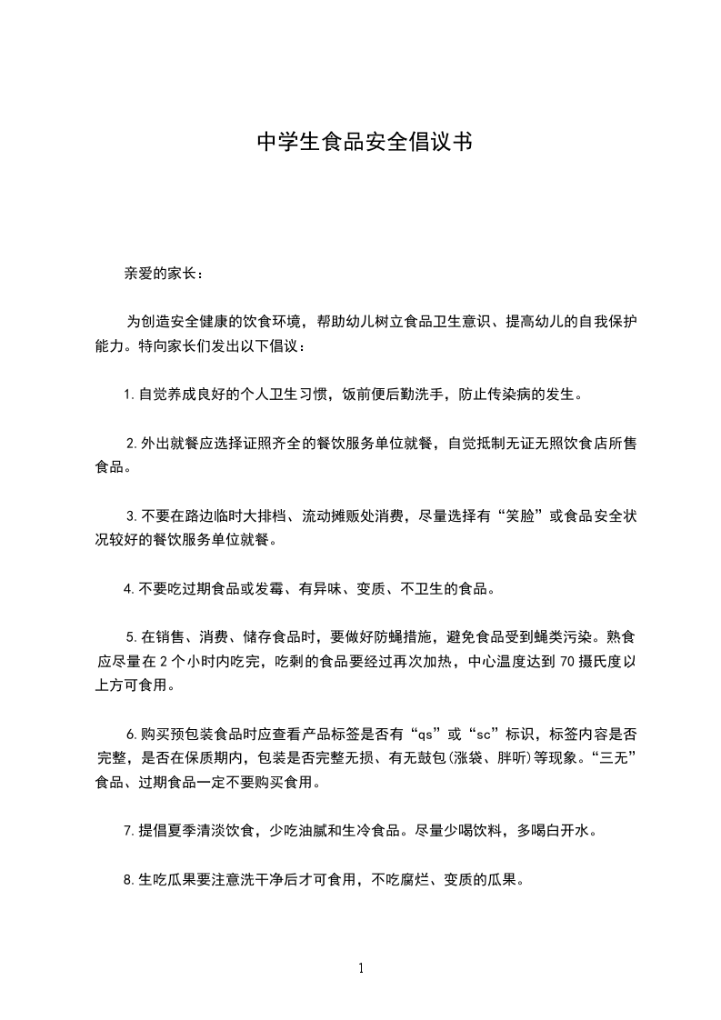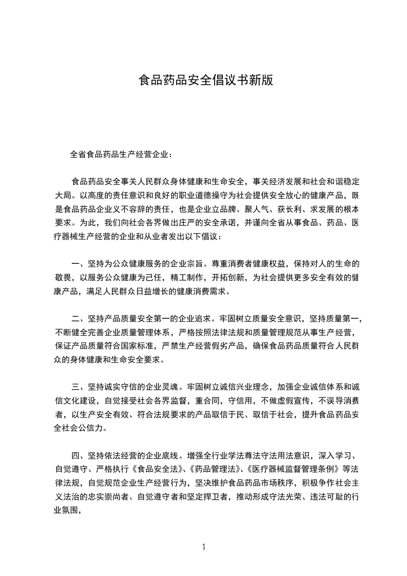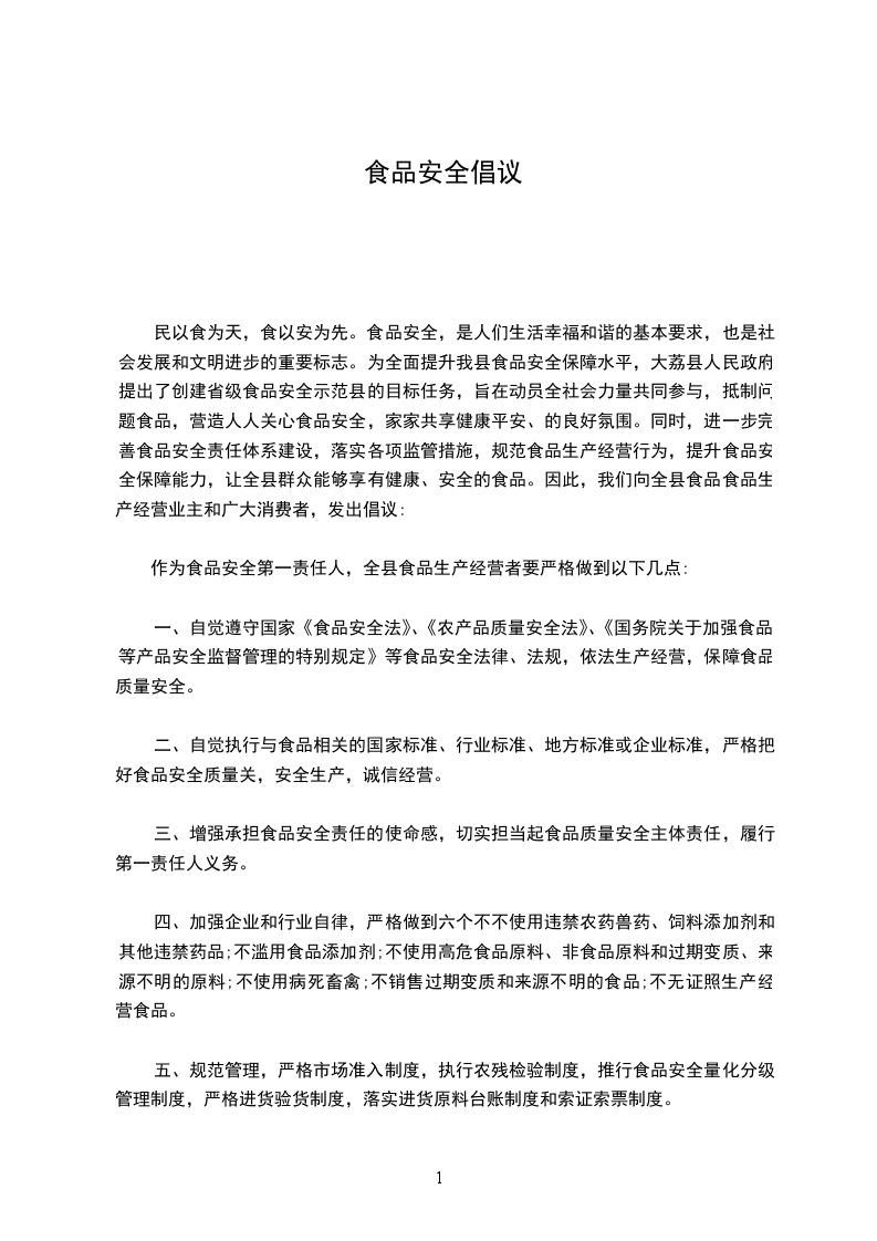 民以食为天,食以安为先。食品安全,是人们生活幸福和谐的基本要求,也是社会发展和文明进步的重要标志。为全面提升我县食品安全保障水平,大荔县人民政府提出了创建省级食品安全示范县的目标任务,旨在动员全社会力量共同参与,抵制问题食品,营造人人关心食品安全,家家共享健康平安、的良好氛围。同时,进一步完善食品安全责任体系建设,落实各项监管措施,规范食品生产经营行为,提升食品安全保障能力,让全县群众能够享有健康、安全的食品。因此,我们向全县食品食品生产经营业主和广大消费者,发出倡议: