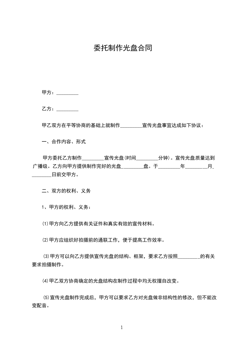 甲方委托乙方制作_________宣传光盘(时间_________分钟)。宣传光盘质量达到广播级。乙方向甲方提供制作完好的光盘_________盘。于_________年_________月_________日前交甲方。