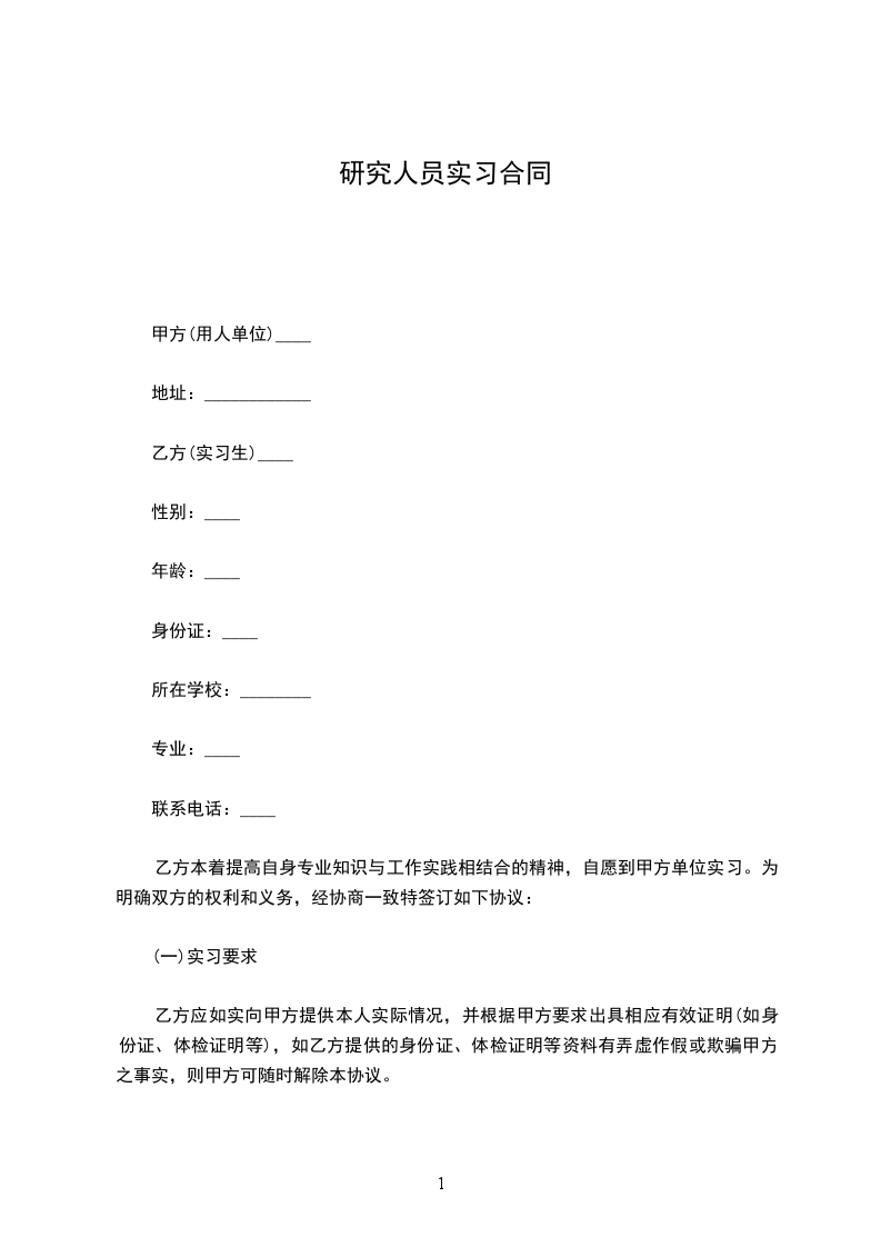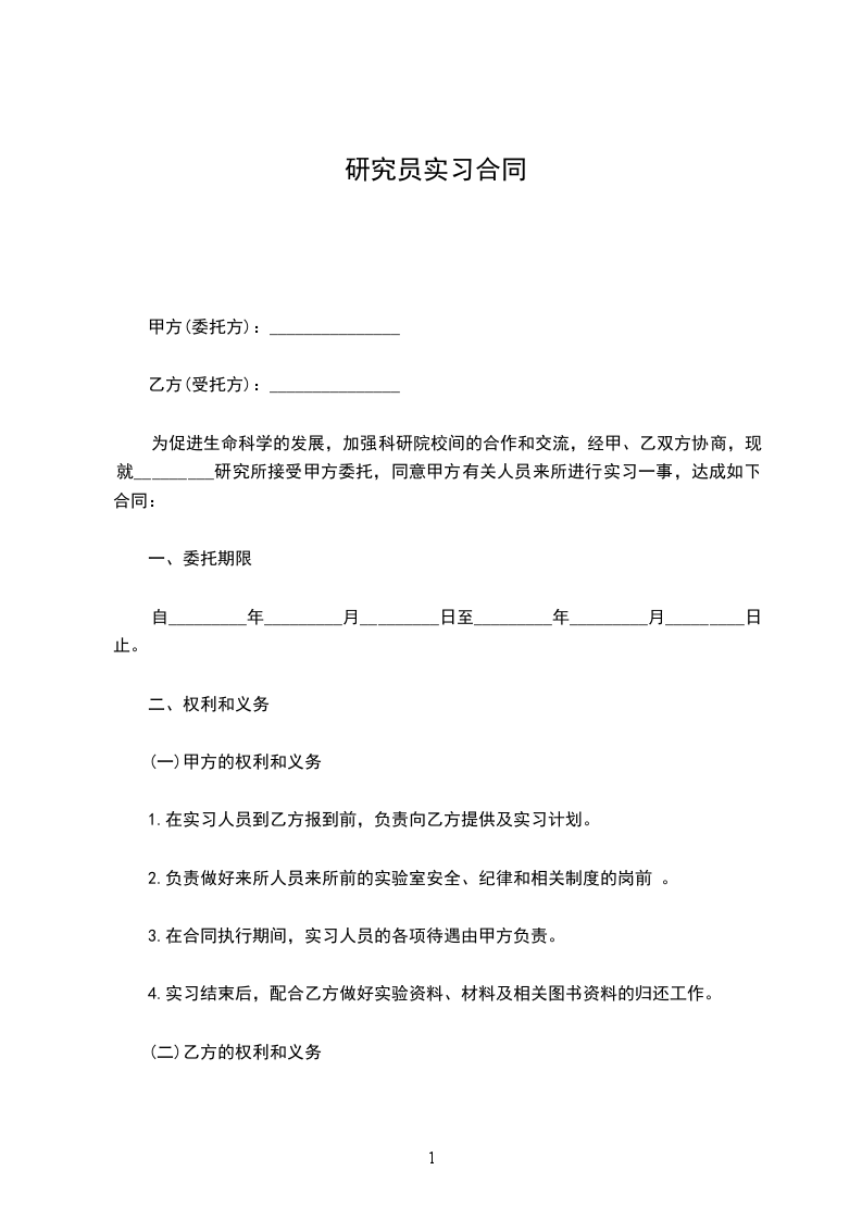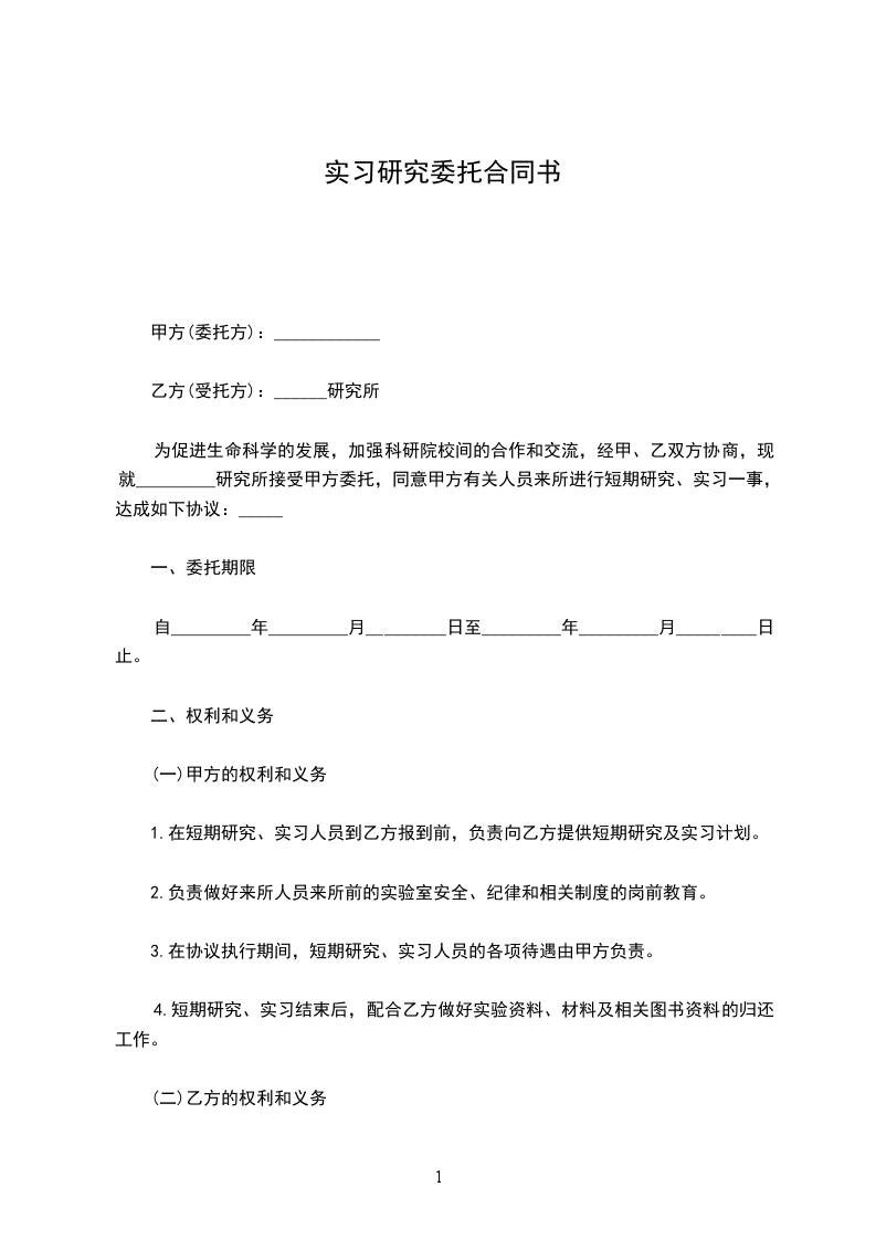 为促进生命科学的发展,加强科研院校间的合作和交流,经甲、乙双方协商,现就_________研究所接受甲方委托,同意甲方有关人员来所进行短期研究、实习一事,达成如下协议: