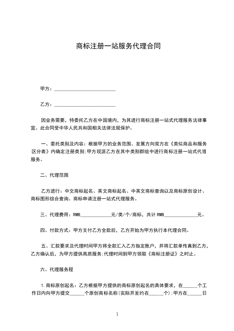 1.商标原创起名:乙方根据甲方提供的商标原创起名的具体要求,在______个工作日内向甲方提交______个原创商标名称(实际开发约在______个);甲方在______日内将以上商标名称按喜爱程度排序后,电邮或传真给乙方;乙方在相关类别免费查询,以第一通过可以注册的商标名称为准。