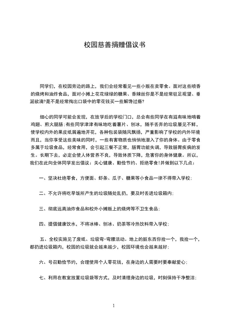 细心的同学可能会发现,在放学后的学校门口,总会有些同学在有滋有味地啃着鸡翅、煎火腿肠;有些同学津津有味地吃着薯片、刨冰,随手丢弃的垃圾屡见不鲜,使学校内外的果皮纸屑遍地开花,各种包装袋随风飘扬,严重影响了学校的内外环境。而且,当你享受这些美味的同时,一些有害物质也悄悄地潜入了你的身体。由于零食多属于垃圾食品,经常食用,会引起三餐不正常,肠胃功能失调,导致肠胃疾病的发生。长期下去,必定会使人体营养不良,导致体质下降,危害你的身体健康。所以,我们在此向全体同学发出倡议:关心健康、勤俭节约、拒绝零食!并做到以下几点: