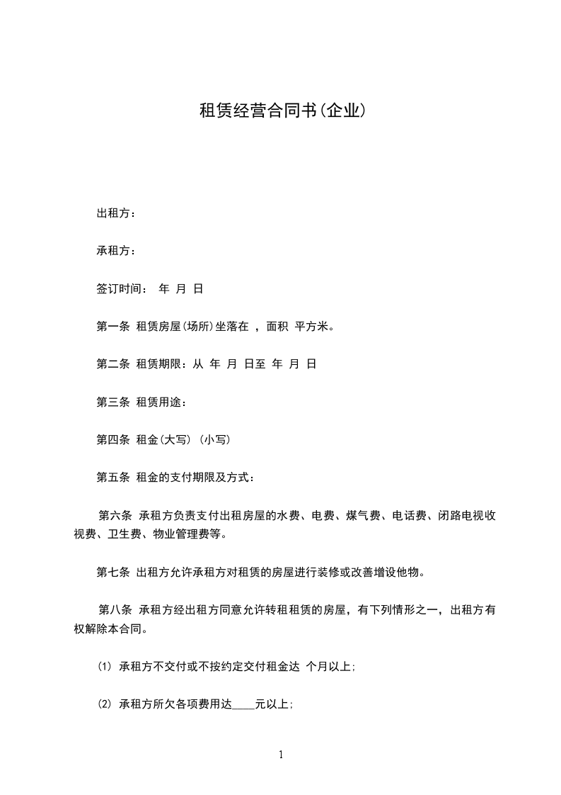 一、甲方同意双方的要求,将____________租赁给乙方经营使用,经双方协商签订本合同,共同遵守。