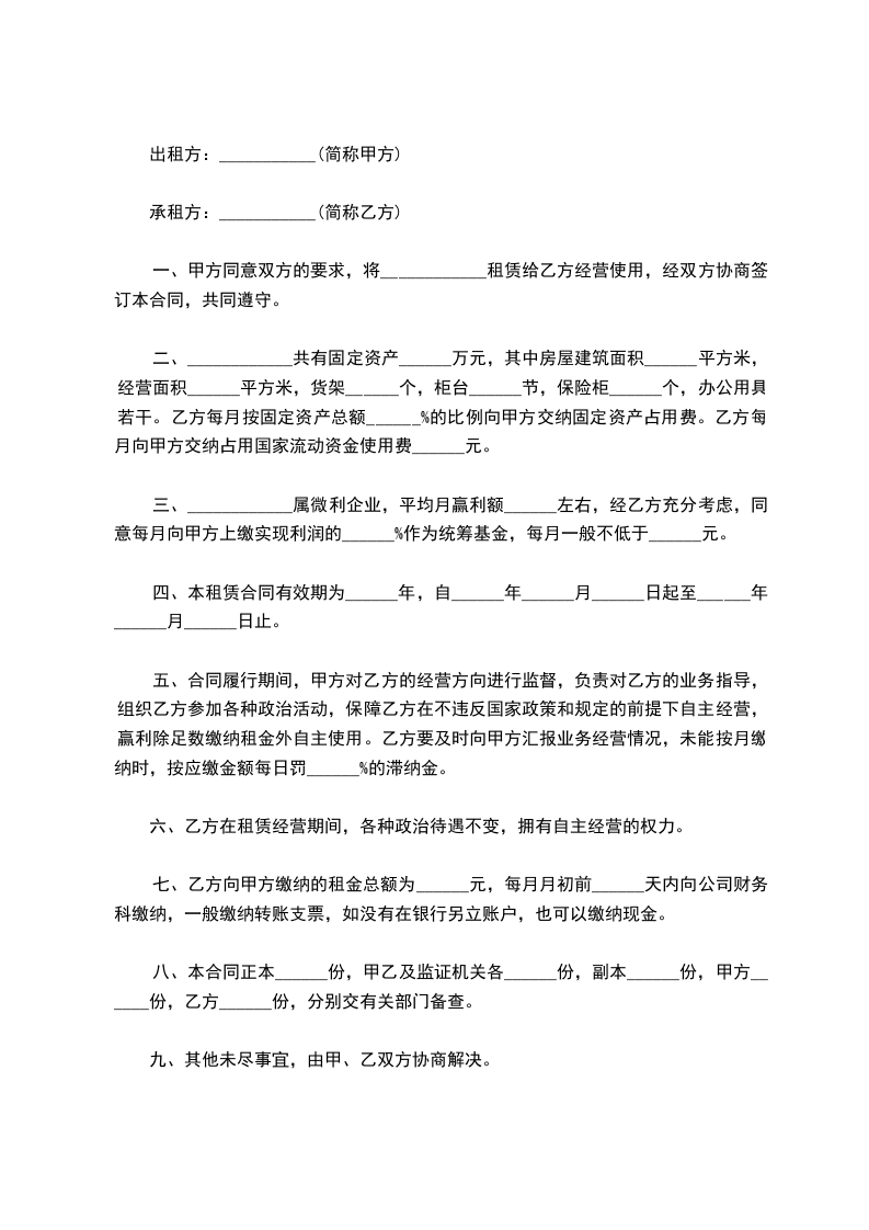 五、合同履行期间,甲方对乙方的经营方向进行监督,负责对乙方的业务指导,组织乙方参加各种政治活动,保障乙方在不违反国家政策和规定的前提下自主经营,赢利除足数缴纳租金外自主使用。乙方要及时向甲方汇报业务经营情况,未能按月缴纳时,按应缴金额每日罚______%的滞纳金。