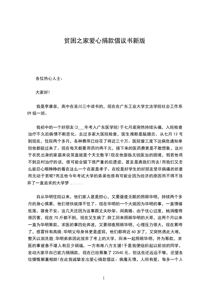 我初中的一个好朋友(2___年考入广东医学院)于七月底突然持续头痛,入院检查治疗不久后病情不断恶化。去过多家大医院检查,医生推断是脑膜炎。从七月13号到现在,住院两个多月,各种费用已经花了将近三十万。医院曾三度下达病危通知单,但他都挺过来了。现在每天都要用药约两千元,接下来的医药费更是不敢想象,这对于农民出身的家庭来说简直就是个天文数字!现在他面临无钱医治的困境,假若他得不到及时治疗的话,很可能会留下很严重的后遗症,甚至是离我们而去!而我们又怎么能忍心眼睁睁的看在这么一个在家是孝子、在校是好学生的好朋友受尽病痛的折磨而无动于衷呢?而且他今年考试大学的弟弟也很有可能会因为经济的原因而不得不放弃了一直追求的大学梦.......
