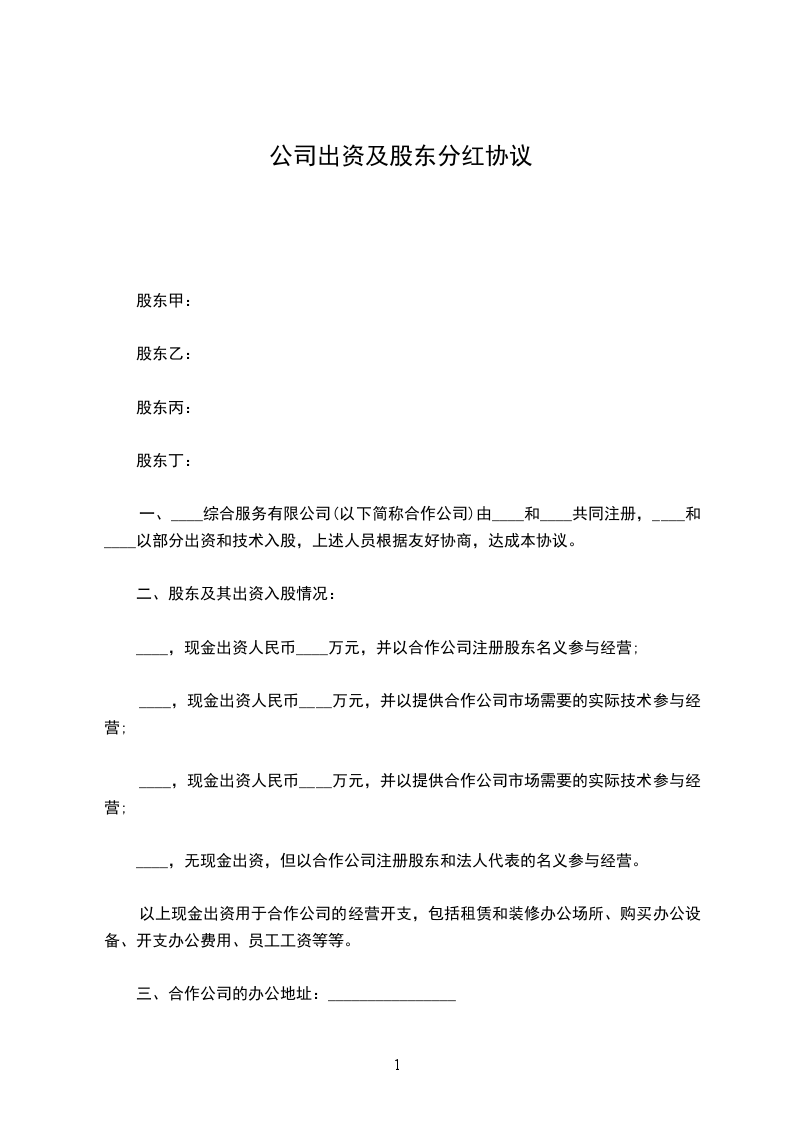 一、____综合服务有限公司(以下简称合作公司)由____和____共同注册,____和____以部分出资和技术入股,上述人员根据友好协商,达成本协议。