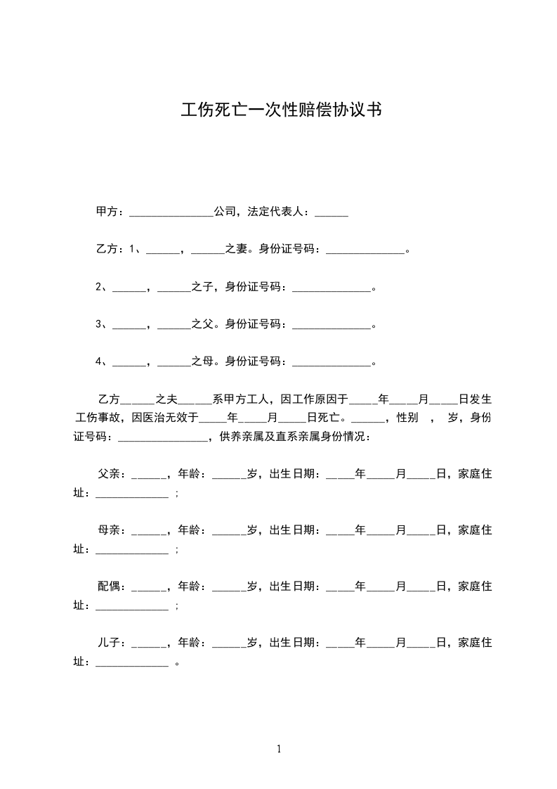 乙方______之夫______系甲方工人,因工作原因于_____年_____月_____日发生工伤事故,因医治无效于_____年_____月_____日死亡。______,性别 , 岁,身份证号码:________________,供养亲属及直系亲属身份情况: