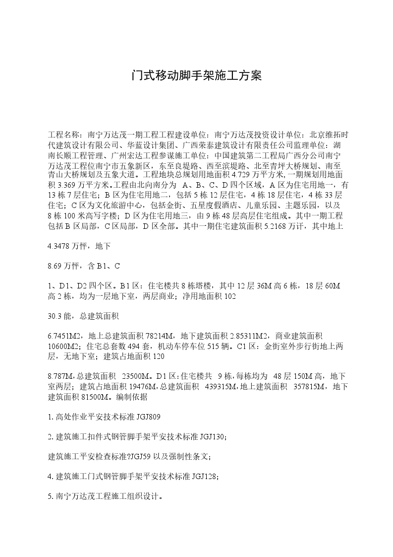 3.3移动门式架搭设工艺1搭设要求为了满足现场吊顶施工要求,综合考虑施工本钱、平安等要求,决定局部采用移动式作业平台进行施工。移动式作业平台采用钢管连接,移动轮采用万向轮。搭设所用的钢管、扣件、脚手板、万向轮等应按照标准要求进行检查验收,不合格产品不得使用。2搭设工艺平台面满铺2M长50MM厚脚手板,周边设置可拆卸的0.6M高防护栏杆,栏杆周围扎密目网。水平加固杆、剪刀撑等加固杆件必须与门架同步搭设,水平加固杆应设门架立杆内侧,剪刀撑应设门架立杆外侧。