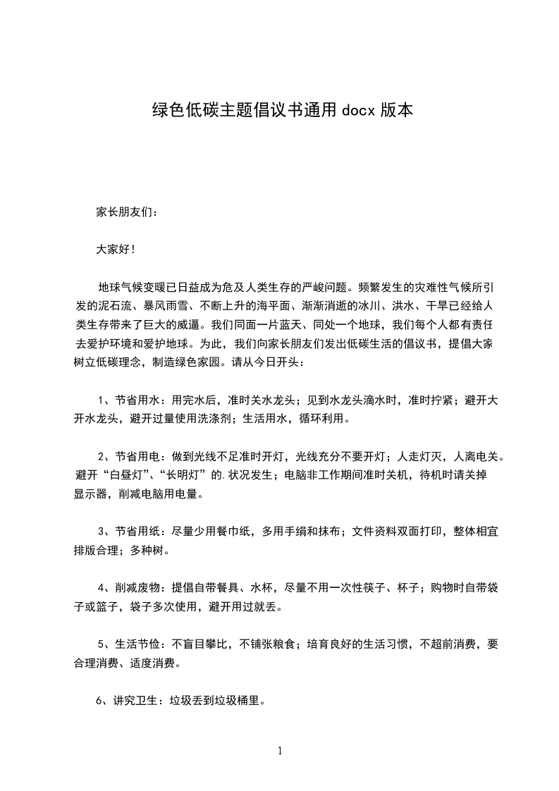 地球气候变暖已日益成为危及人类生存的严峻问题。频繁发生的灾难性气候所引发的泥石流、暴风雨雪、不断上升的海平面、渐渐消逝的冰川、洪水、干旱已经给人类生存带来了巨大的威逼。我们同面一片蓝天、同处一个地球,我们每个人都有责任去爱护环境和爱护地球。为此,我们向家长朋友们发出低碳生活的倡议书,提倡大家树立低碳理念,制造绿色家园。请从今日开头:
