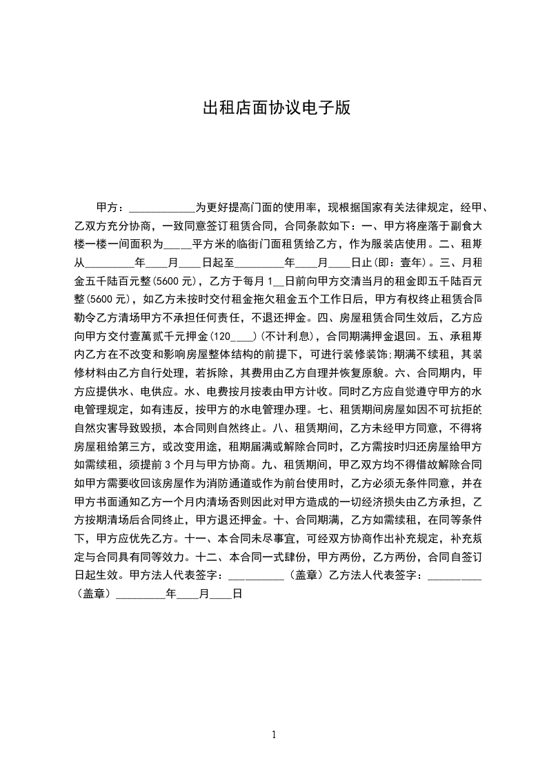 一、甲方将座落于副食大楼一楼一间面积为_____平方米的临街门面租赁给乙方,作为服装店使用。