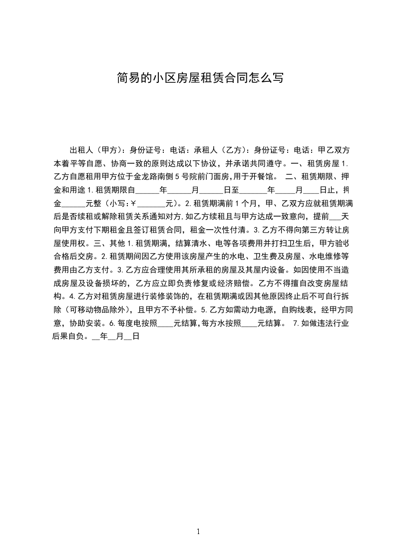 1.租赁期限自______年______月______日至_______年_____月____日止,押金______元整(小写:¥_______元)。